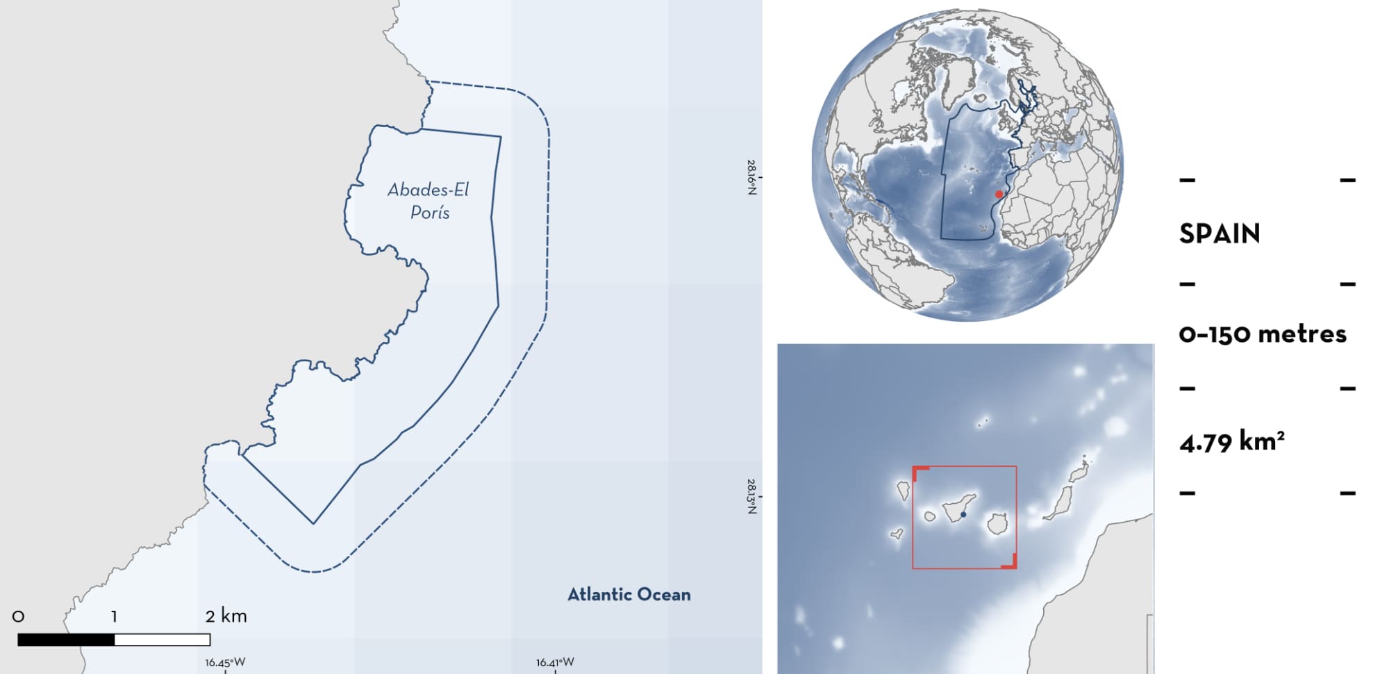 Abades-El Porís is located on the southeast coast of Tenerife, in the Canary Islands, Spain. The area is characterised by extensive sandy substrates, rocky outcrops, volcanic reef structures, and patches of seagrass beds. The area overlaps with the Oceanic Islands and Seamounts of the Canary Region Ecologically or Biologically Significant Marine Area. Within this area there are: threatened species (e.g., Angelshark Squatina squatina); and reproductive areas (e.g., Common Smoothhound Mustelus mustelus).