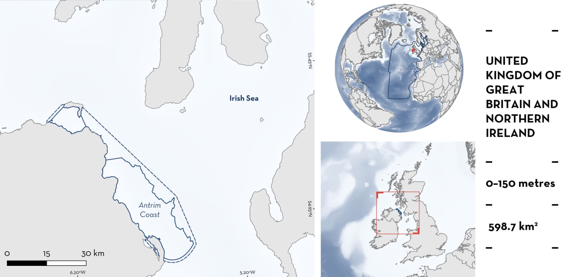 Antrim Coast is s located on the coast of Northern Ireland in the United Kingdom of Great Britain and Northern Ireland. The area encompasses many bays and inlets including Red Bay, which is characterised by sandbanks of live maerl, gravel, cobbles, and sub-fossil maerl (DAERA 2025a), and Belfast Lough, a large intertidal estuary of the River Lagan. The outer lough is mainly rocky shores and small sandy bays, and the inner lough consists of mudflats and lagoons (Ramsar 2025). Just offshore and north of Belfast Lough is the Maidens, a group of small rocky reefs off northeast Larne. These reefs have rare habitats due to regional hydrographic conditions. The Maidens is within the North Channel, which connects the Atlantic Ocean to the Irish Sea, experiencing fast flowing currents and in close proximity to deep upwelling water (DAERA 2025b). Rathlin Island is in the north of the area and includes reefs, submerged sea caves, shallow sandbanks, and vegetated sea cliffs of the Atlantic coast (DAERA 2025c). Larne Lough consists of mudflats and mussel-beds (KBA 2025b).