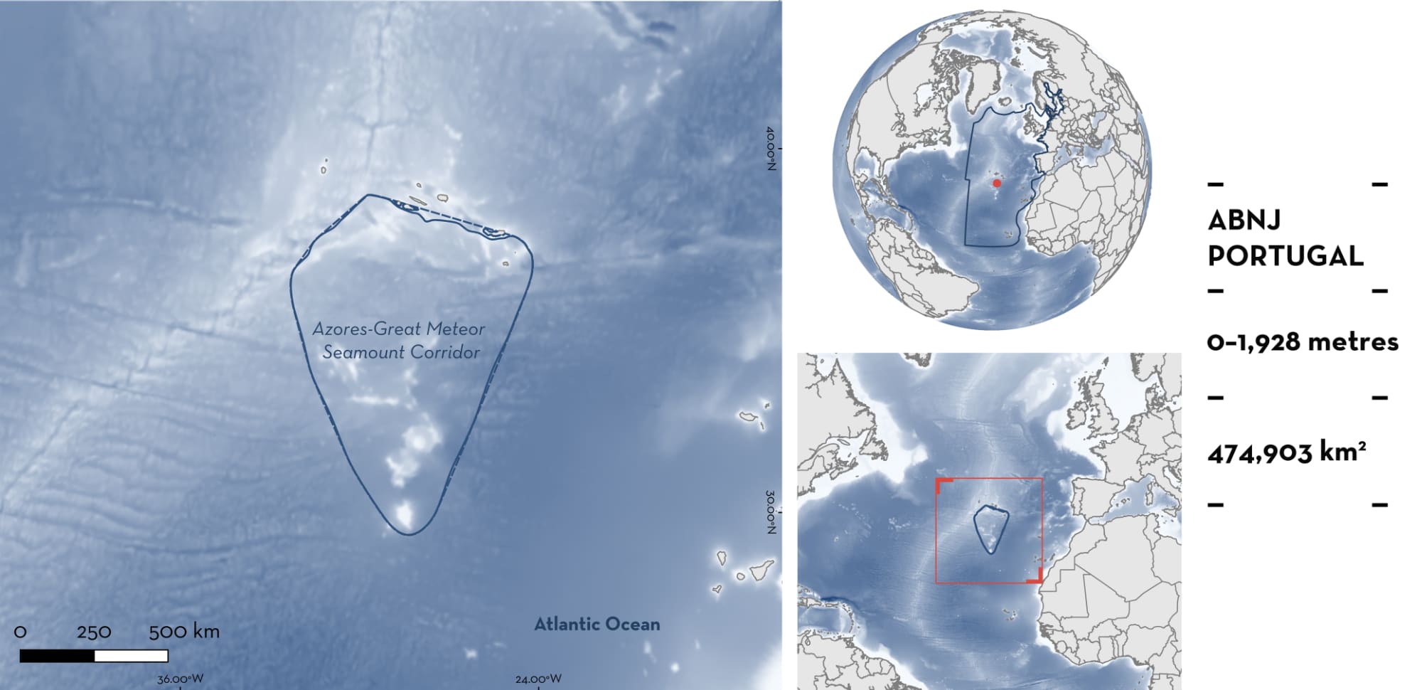 Azores-Great Meteor Seamount Corridor is located in the middle of the North Atlantic Ocean. It spans pelagic waters from the Azores Archipelago, Portugal, and areas beyond national jurisdiction (ABNJ) south of the Azores and around the Great Meteor Seamount. The area expands from the Azores slope and is characterised by the presence of multiple banks, seamounts of various summit depths, flat summit plateaus, terraces, and ridges. It overlaps with two Ecologically or Biologically Significant Marine Areas, two Key Biodiversity Areas, and three protected areas. Within this area there are: threatened species (e.g., Sicklefin Devil Ray Mobula tarapacana) and areas important for movement (e.g., Blue Shark Prionace glauca).