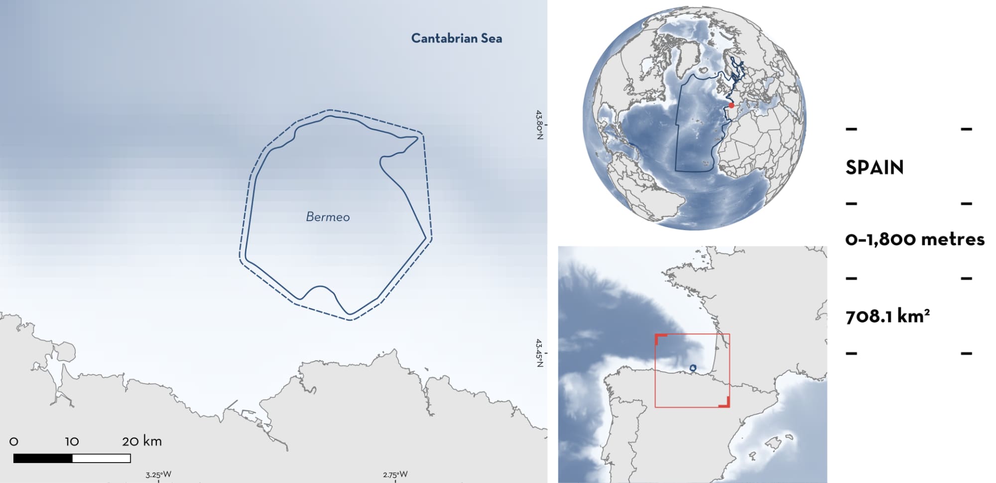 Bermeo is located offshore of Vizcaya and Guipúzcoa provinces, Basque Country, Spain. This area encompasses part of the continental shelf and the slope towards the Capbreton canyon system. The habitat is characterised by rocky, sandy-muddy, and sandy substrates with pockmarks. The area is influenced by a marked seasonal stratification and mixing, with moderate wind-driven upwelling, eddies, and freshwater input from local rivers, contributing to nutrient enrichment and enhanced primary productivity. The area overlaps with the Cantabrian Sea (Southern Bay of Biscay) Ecologically or Biologically Significant Marine Area. Within this area there are: reproductive areas (Blue Shark Prionace glauca).