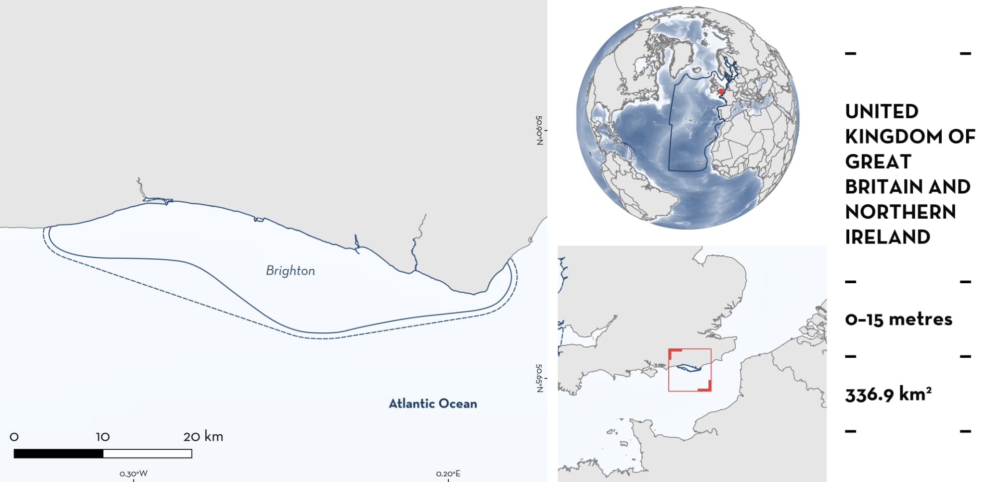 Brighton is located on the south coast of England, United Kingdom of Great Britain and Northern Ireland. The substrate in the area is characterised by pebbles, gravel, and chalk. The area openly faces the English Channel and is influenced by prevailing southwesterly winds. Within this area there are: reproductive areas (e.g., Starry Smoothhound Mustelus asterias).