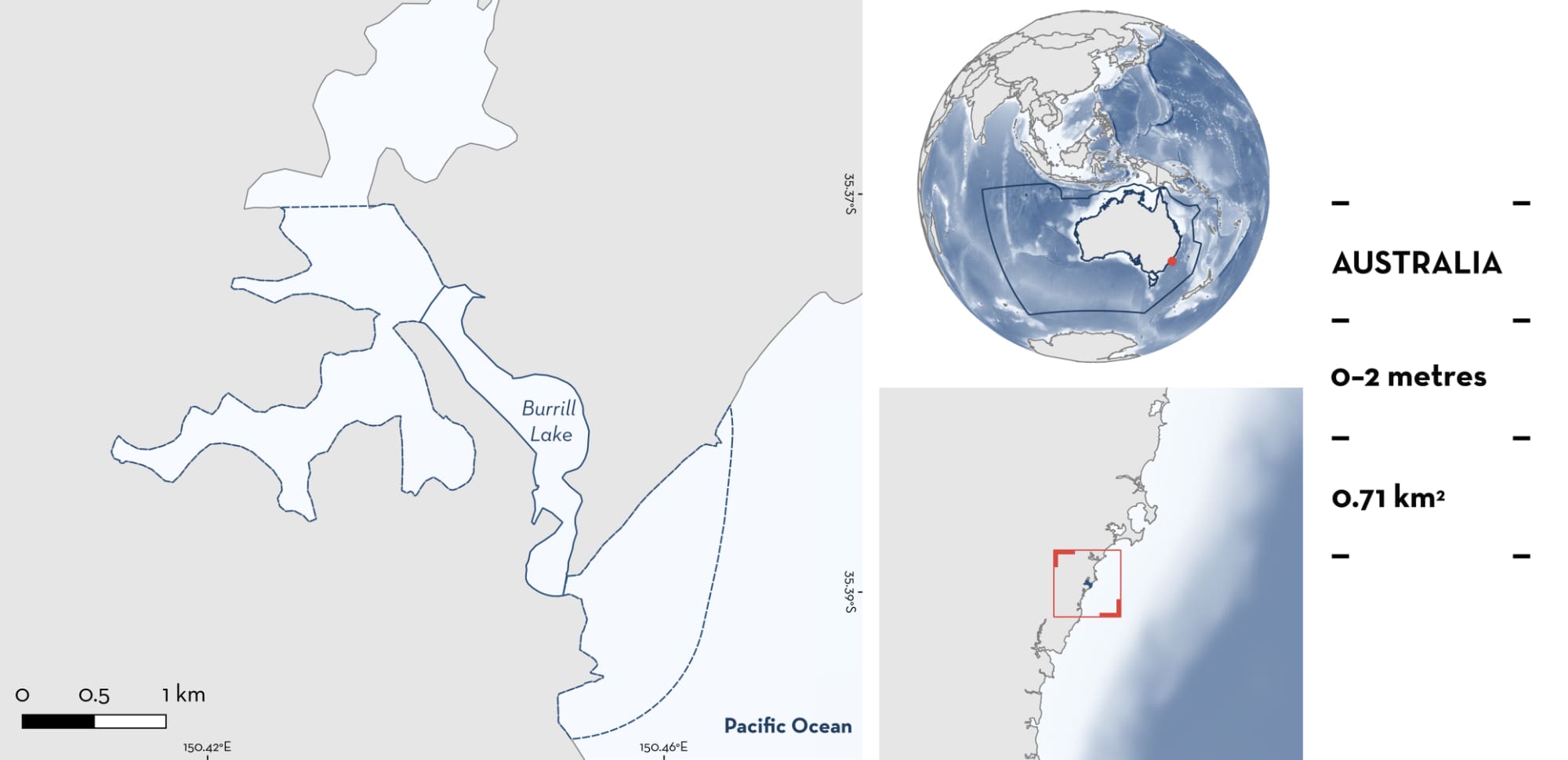 Burrill Lake is located on the south coast of New South Wales, Australia. It is a small estuary connected to the sea by a narrow channel. It is characterised by seagrass beds and sandy and muddy substrates. Within this area there are: threatened species (Estuary Stingray Hemitrygon fluviorum); and feeding areas (e.g., Common Stingaree Trygonoptera testacea).