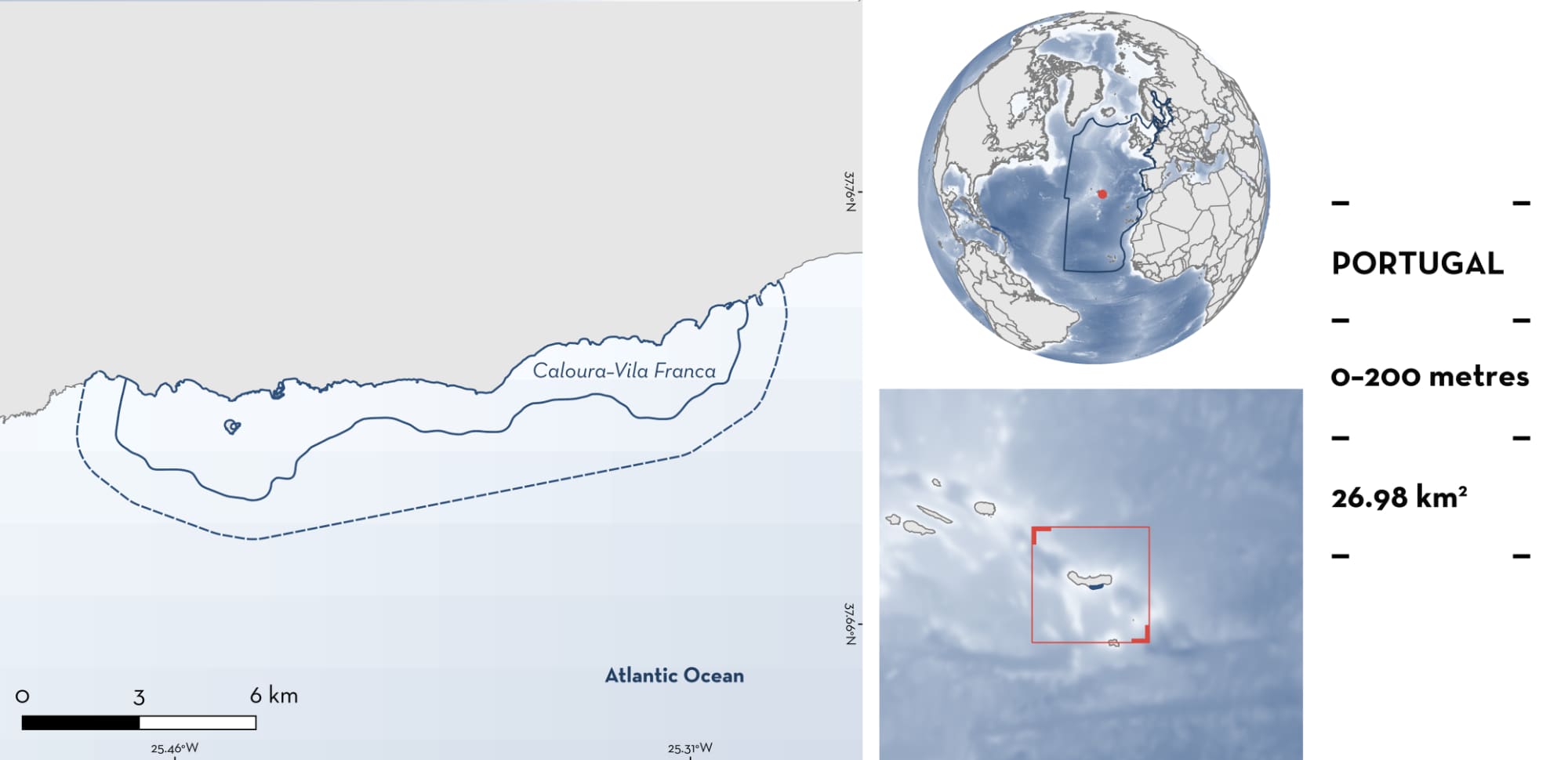 Caloura-Vila Franca is located on the southern coast of São Miguel Island, Azores, Portugal. This area is situated on the island’s narrow shelf and steep upper slope. The substrate is characterised by rugged slopes and rocky drop-offs, alternating with soft sediments, and black coral gardens. Within this area there are: threatened species and reproductive areas (Tope Galeorhinus galeus).