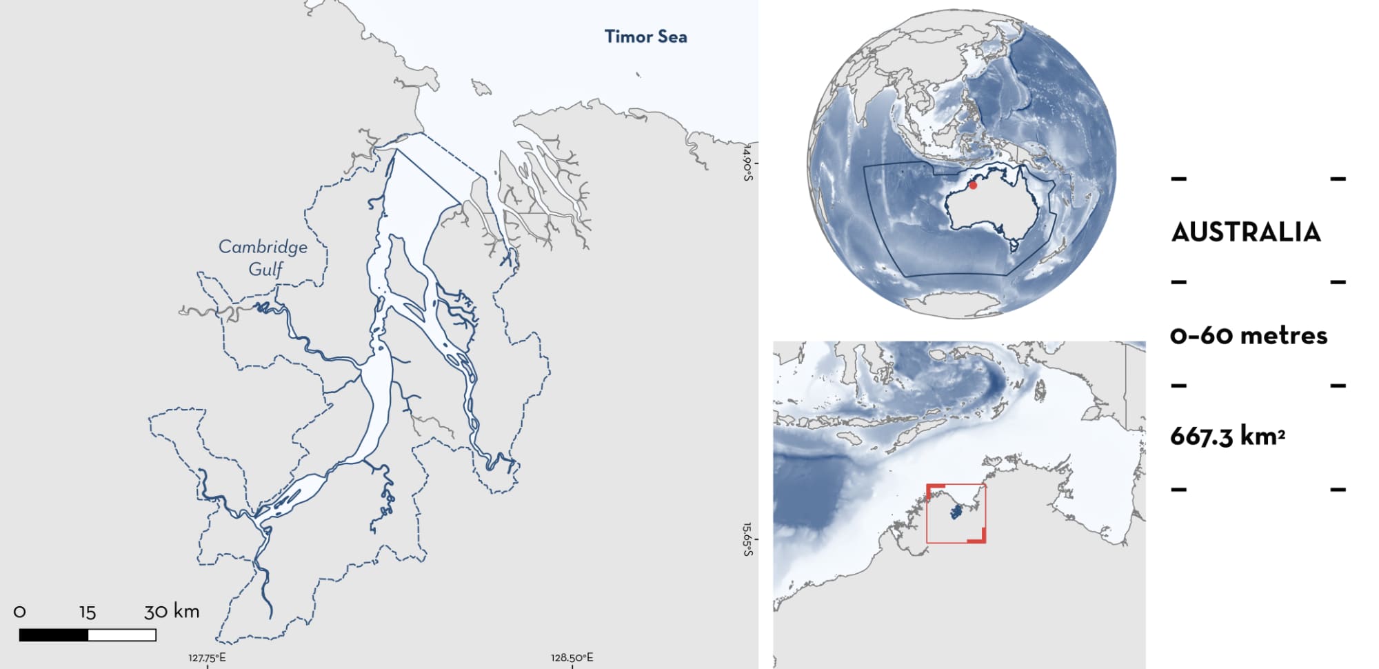 Cambridge Gulf is located in the Kimberley region of Western Australia, Australia. The area opens into Joseph Bonaparte Gulf and the Timor Sea. The area encompasses the lower reaches of five rivers (Ord, Durack, Pentecost, King, and Forrest Rivers) and the West Arm of Cambridge Gulf. Numerous islands occur in the area, the largest of which, Adolphus Island, sits at the convergence of the Ord River and the West Arm. Cambridge Gulf is characterised by muddy substrates, mudflats, deep channels, rocky escarpments, and fringing vegetation ranging from mangroves to savanna grassland (DPIRD 2025). Bathymetry is highly variable with vast areas of exposed mudflats at low tide to deep channels reaching 60 m depth (DPIRD 2025).