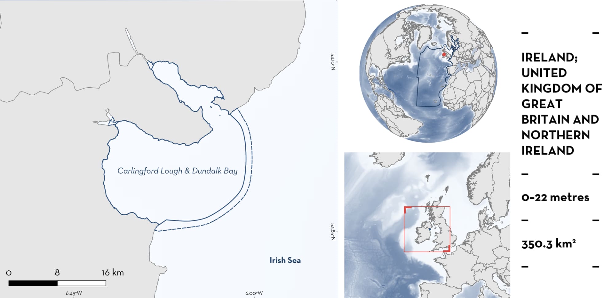 Carlingford Lough & Dundalk Bay is located on Ireland’s northeast coast. The area extends 15 km offshore into the Irish Sea and encompasses a glacial fjord and a bay supporting habitats such as saltmarshes, intertidal mudflats, infralittoral mud, and eelgrass beds. The area overlaps the Dundalk Bay Ramsar Site. Within this area there are: threatened species and undefined aggregations (Tope Galeorhinus galeus).