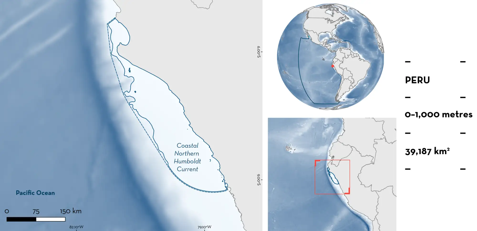 Coastal Northern Humboldt Current is located in Peru and extends from the southern Piura region to northern La Libertad region. Situated within the Humboldt Current Large Marine Ecosystem (LME), the area overlaps with the Northern Humboldt Current System (NHCS), which is one of the most productive ocean ecosystems due to its coastal upwelling producing a high abundance of zooplankton that sustains the ecosystem (Pennington et al. 2006). Oceanographic features, associated with wind forcing, create strong upwelling and high levels of primary productivity in the offshore waters of northern Peru (Bakun & Weeks 2008; Montecino & Lange 2009). Warm subtropical waters move closer to the coast in the austral summer and autumn, and coastal upwelling disperses them in winter and spring (Bakun & Weeks 2008). This upwelling, and its associated productivity, allow the development of an exceptionally high biomass of ecologically important marine species such as Peruvian Anchoveta Engraulis ringens and Humboldt Squid Dosidicus gigas (Bakun & Weeks 2008; Gonzalez-Pestana et al. 2022).