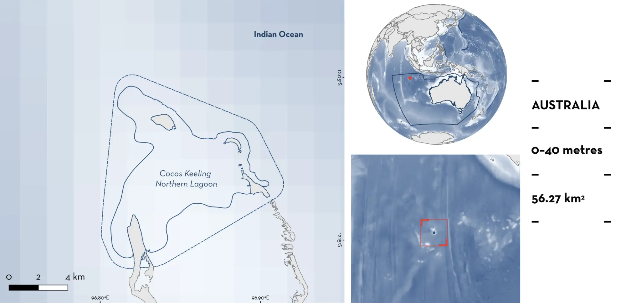 Cocos Keeling Northern Lagoon is located in the Cocos (Keeling) Islands, a remote Australian territory in the Eastern Indian Ocean. This area comprises several small islands, including Horsburgh Island (also known as Pulu Luar), Direction Island (Pulau Tikus), and Home Island (Pulau Selma, the only inhabited island in this area). The islands are approximately 2,800 km northwest of Perth, Australia, and 1,200 km southwest of Jakarta, Indonesia (Evans et al. 2016). The habitat is predominantly formed by coral reef and unconsolidated sediment (O’Keeffe et al. 2017). The surrounding waters of the atoll reach depths of 5,000–6,000 m, creating an isolation barrier (Parks Australia 2025). The Cocos (Keeling) Islands represent the westernmost extension of the Western Pacific marine biogeographic region and have been reported to host marine species typically affiliated with both the Indian and Pacific Oceans (Hobbs & Allen 2014).
