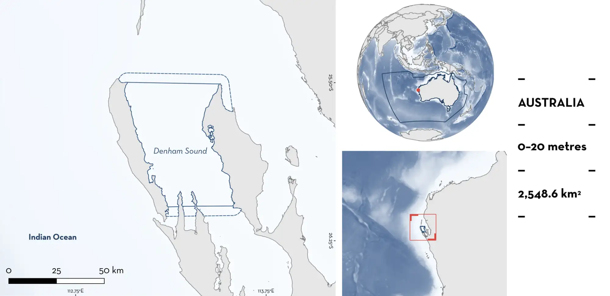 Denham Sound is located in Western Australia, Australia. This area encompasses the western gulf of northern Shark Bay. Shark Bay is a large semi-enclosed embayment primarily <20 m in depth (average = 10 m). This section is dominated by the world’s most extensive seagrass beds, primarily Amphibolis antarctica (Walker et al. 1988; Walker 1989).