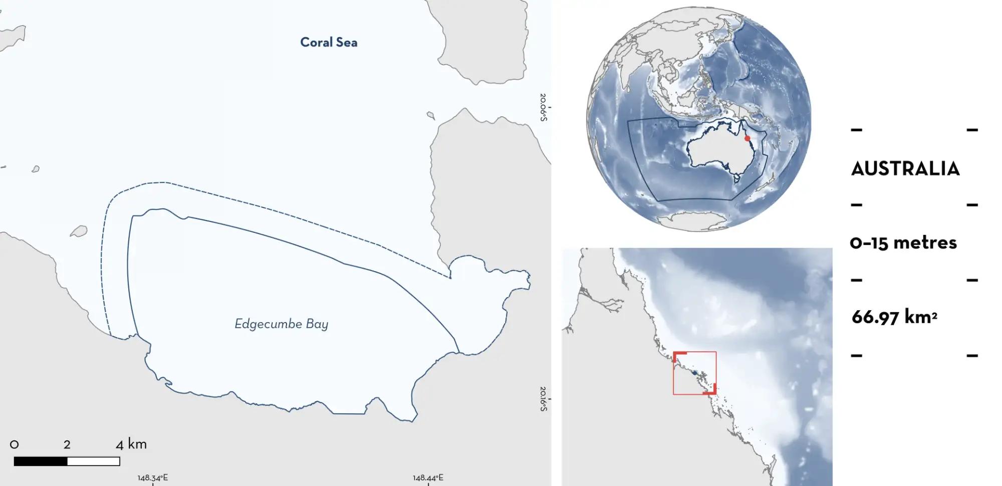 Edgecumbe Bay is located along the Whitsunday Coast in Queensland, Australia. It encompasses the estuaries of Greta Creek and Greogory River. The area is characterised by mangroves and intertidal flats, with silty substrates and mudflats. The area is influenced by freshwater discharge from the rivers and by southeasterly winds and high water turbidity. Within this area there are: threatened species and reproductive areas (Blacktip Reef Shark Carcharhinus melanopterus).