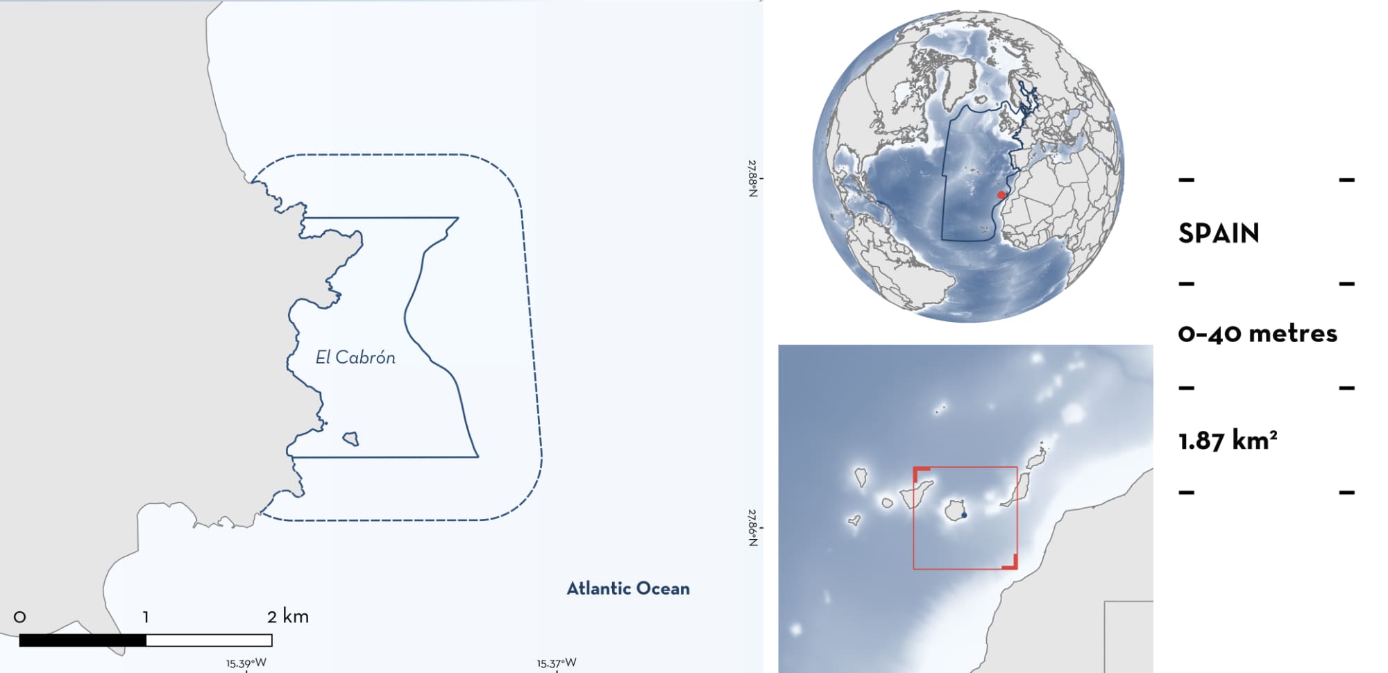 El Cabrón is located on the eastern coast of Gran Canaria Island, Canary Islands, Spain. The area encompasses a coastal terrace and is characterised by rocky reefs, basaltic platforms, sandy plains, and small patches of rhodolite beds and seagrass. It is influenced by the Canary Current and the seasonal coastal upwelling system off northwest Africa, internal waves, and localised coastal currents. The area overlaps with the Oceanic Islands and Seamounts of the Canary Region Ecologically or Biologically Significant Marine Area. Within this area there are: threatened species (e.g., Spiny Butterfly Ray Gymnura altavela); and undefined aggregations (e.g., Angelshark Squatina squatina).