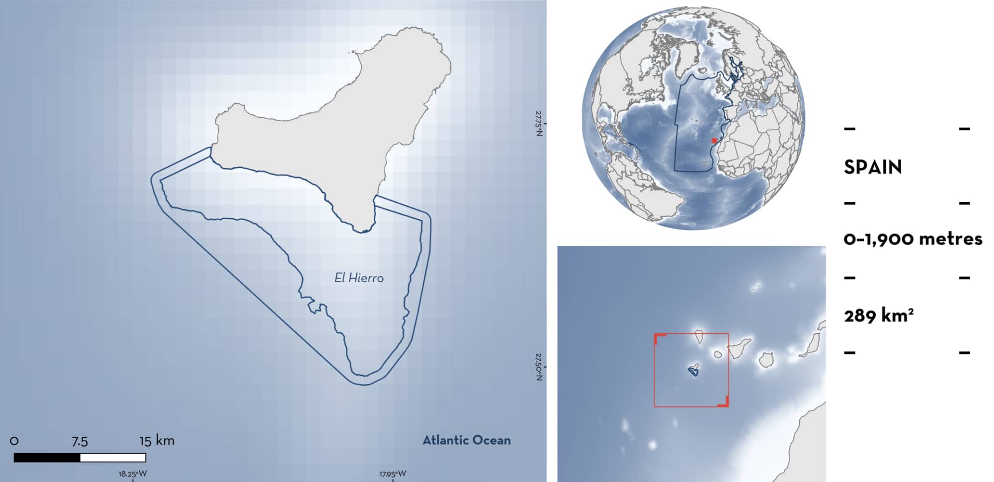 El Hierro is located off the southern coast of El Hierro Island, Canary Islands, Spain. It encompasses the Mar de las Calmas, El Bajón seamount, and the southern coastline of El Hierro Island. The area is characterised by a narrow coastal platform followed by a steep slope, with lava-formed reefs, basaltic terraces, rocky pinnacles, sandy patches, and vertical walls (A Rodríguez-Juncá pers. obs. 2025).