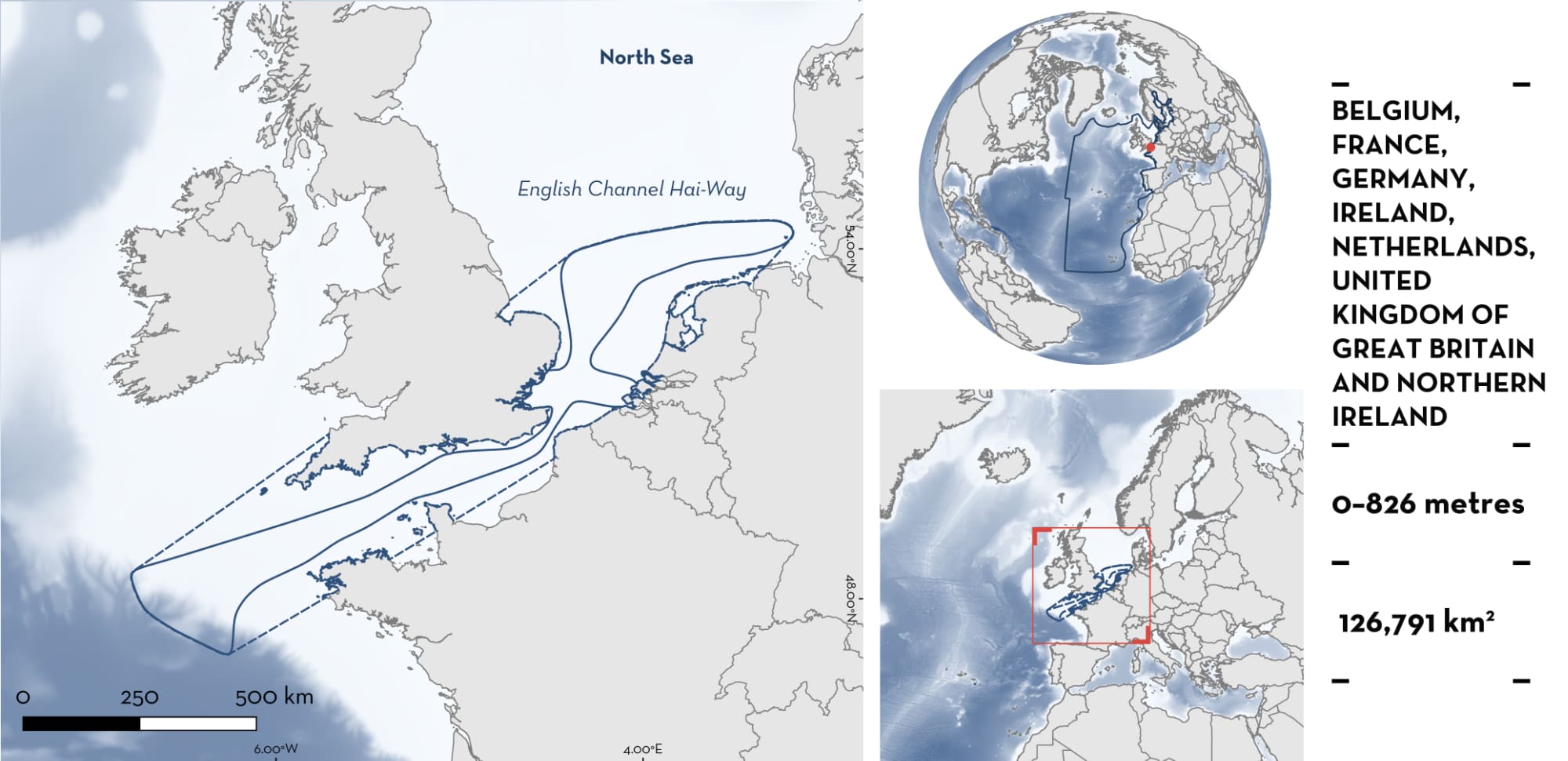 English Channel Hai-Way is a transboundary area connecting the southern North Sea to the English Channel and the Celtic Sea. It spans from the German Bight in Germany and the Netherlands in the east via the English Channel across Belgium, France, and the United Kingdom of Great Britain and Northern Ireland, to the Celtic Sea around France, the United Kingdom of Great Britain and Northern Ireland, and Ireland. The southern North Sea is shallow, lying on the shelf, and is influenced by tides and terrestrial freshwater input. The benthic habitat of the English Channel is mostly comprised of coarse and sandy sediments (James et al. 2007). While the depth and seabed topography of the English Channel is comparatively uniform, the southern North Sea and the German Bight are characterised by a variety of seabed types comprising sandy ridges and ripples, tidal sandbanks and mudflats, mixed sediment, and rocky/hard-substrate habitats. Other habitats in this area include pelagic waters and estuary outflows.