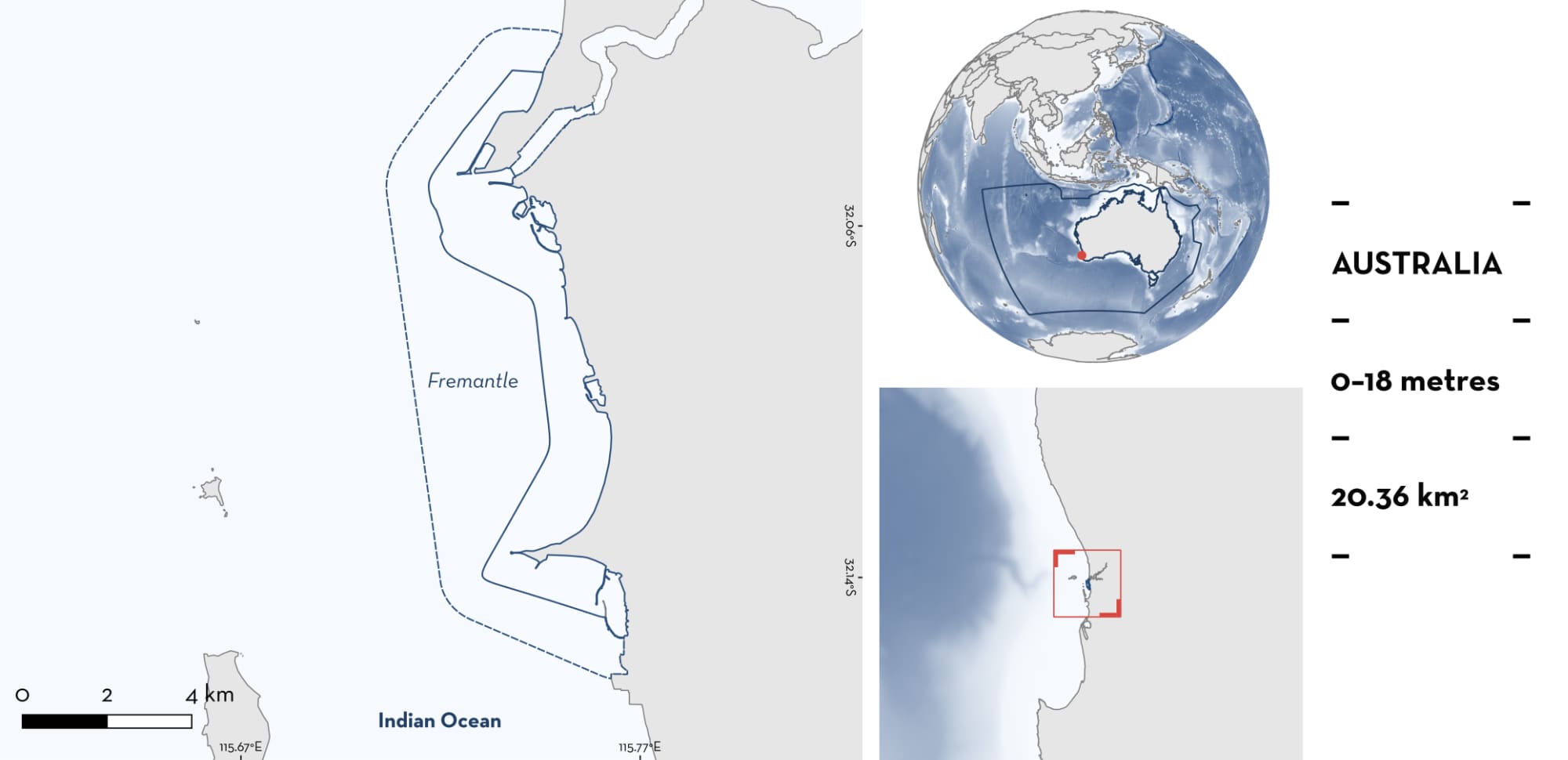 Fremantle is located in southwest Western Australia, Australia. This area covers ~17 km of coastline interrupted by the Swan Estuary. The habitat is characterised by a combination of sand with a mix of limestone reefs, macroalgae, and seagrass meadows. Nearshore circulation is strongly influenced by wave-driven mechanisms, particularly around coastal groynes, where persistent longshore currents and rip currents are generated by wave set-up variations. Within this area there are: range-restricted species (Masked Stingaree Trygonoptera personata); and reproductive areas (Port Jackson Shark Heterodontus portusjacksoni).