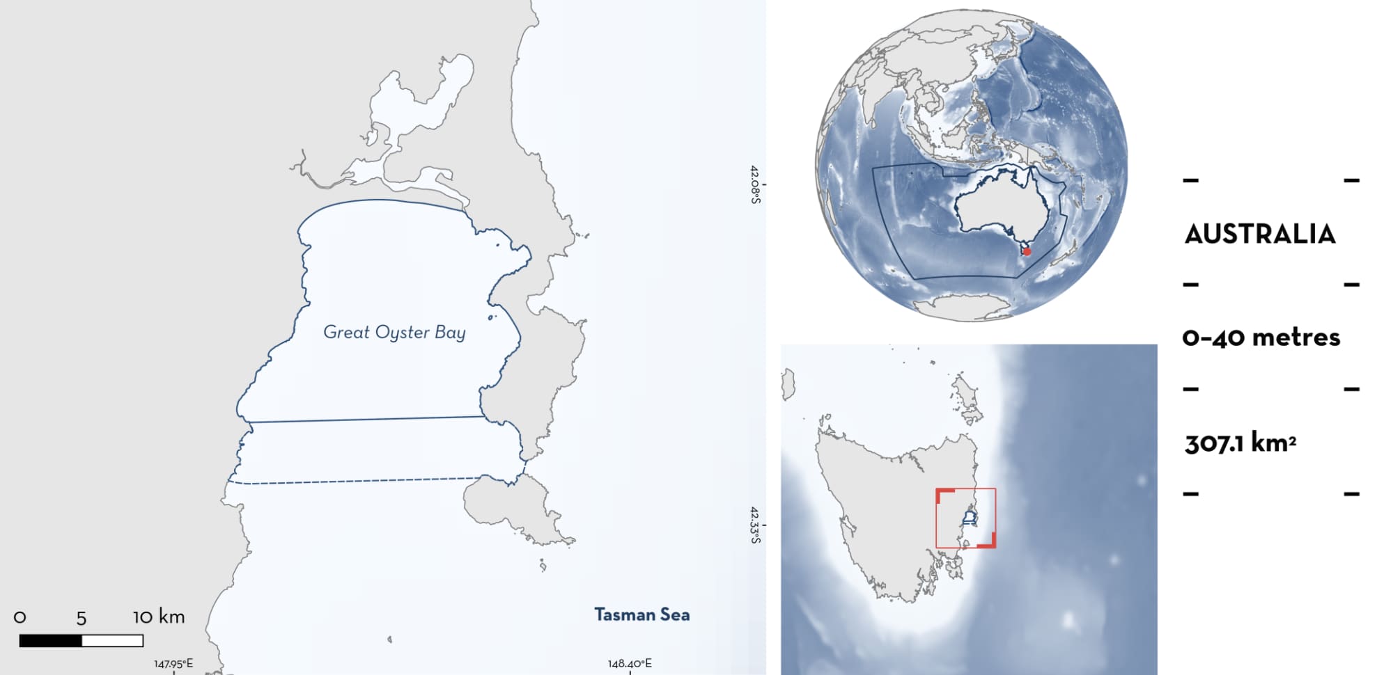 Great Oyster Bay is located on the east coast of Tasmania, Australia. It is a semi-enclosed bay with minimal freshwater input from Moulting Lagoon and is characterised by intertidal flats with seagrass beds, kelp beds, and sandy substrates. This area overlaps with Freycinet National Park and Mayfield Bay Conservation Area and with the Great Oyster Bay Shark Refuge Area. Within this area there are: threatened species and reproductive areas (Tope Galeorhinus galeus).