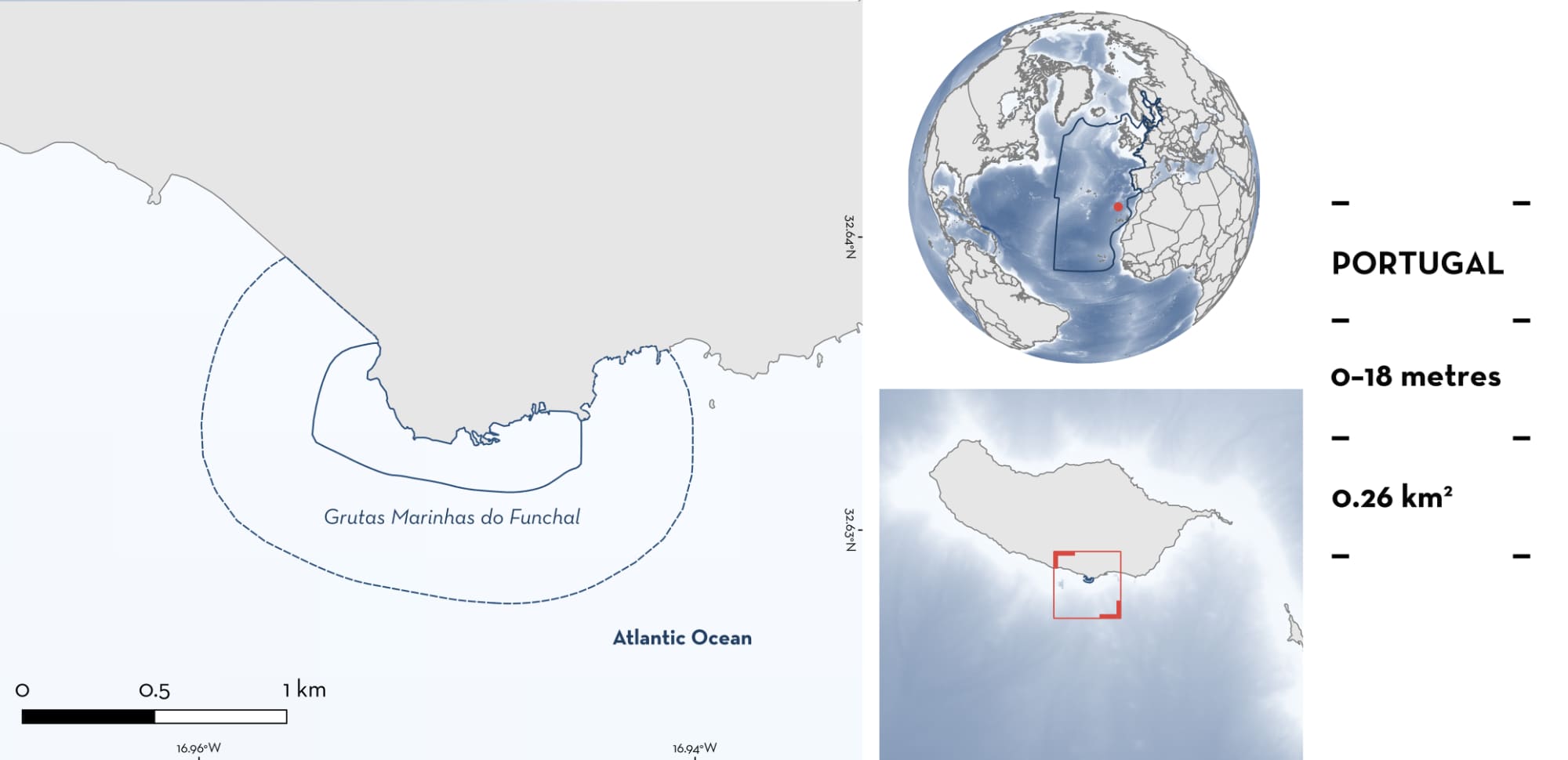 Grutas Marinhas do Funchal is located on the southern coast of Madeira Island, Portugal. It is situated between Praia Formosa and Lido beaches. The habitat is characterised by steep, south-facing volcanic cliffs interspersed with a series of sea caves. The substrate within these caves and along the connecting shore is heterogeneous and transitions from consolidated volcanic rock to unconsolidated boulders and sand with depth (McIvor et al. 2023).