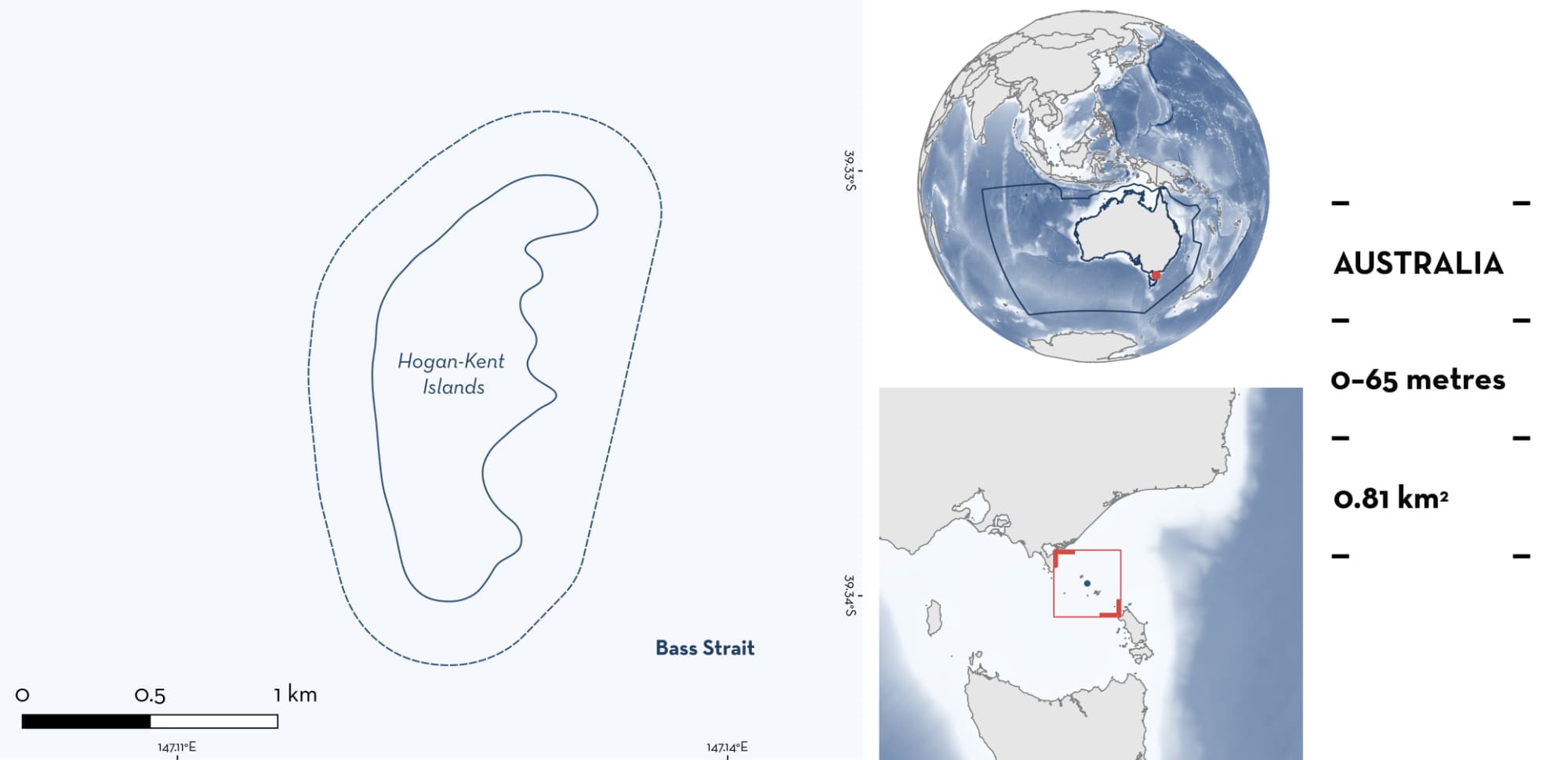Hogan-Kent Islands is located in northeast Bass Strait in southeast Australia. It is situated in th state of Tasmania, near the border with Victoria. The area encompasses a margin of a central ridge reef feature in between two groups of Islands – the Kent Group and the Hogan Group. The habitat is characterised by shelly substrate from scallop beds, sessile invertebrate habitats, rocky reef, and coarse shelly sand substrate (Barrett et al. 2021; University of Tasmania 2024; NESP 2025).