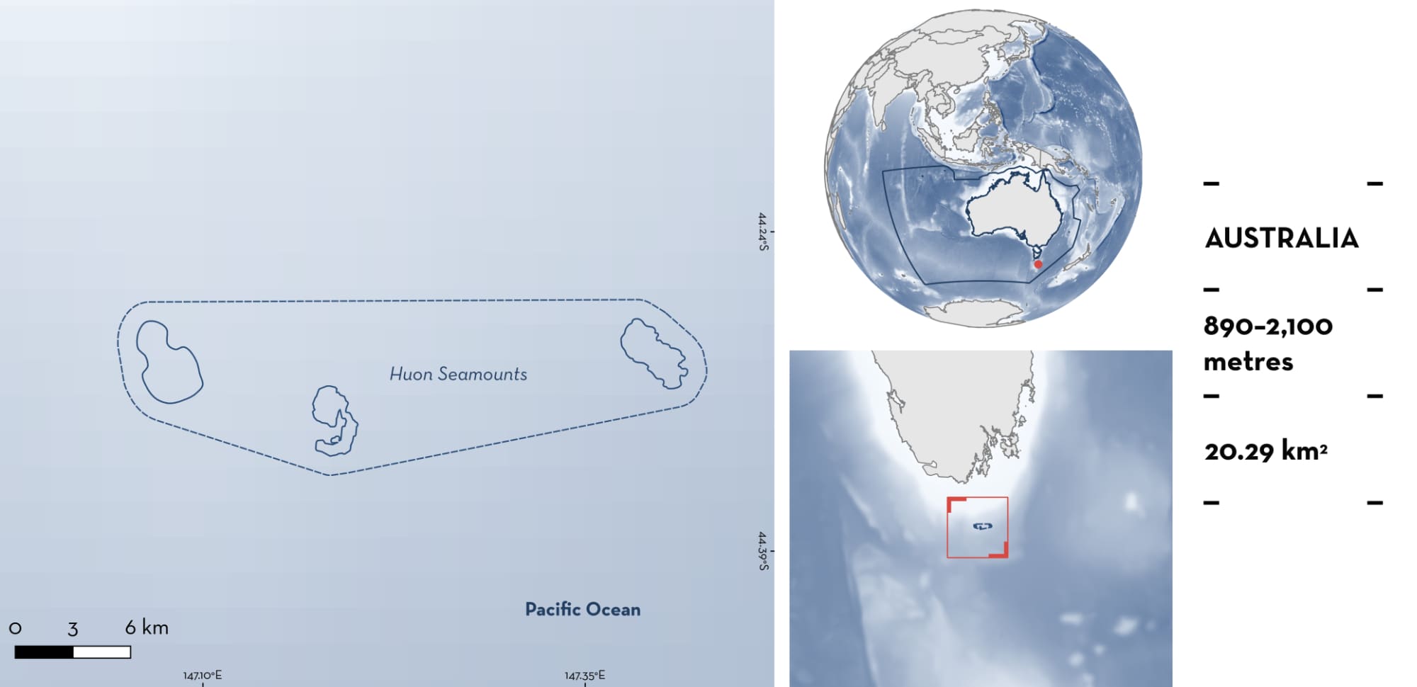 Huon Seamounts is located south of Tasmania, Australia. It is part of a deepsea seamount chain extending along the continental slope off Tasmania and includes three seamounts each separated by ~10 km: Hill K1, Hill U, and z16. The area is characterised by live hard corals (the stony coral Solenosmilia variabilis) around the top of the seamount and coral rubble and rocky and sandy substrates around the edge of the seamounts (Maguire et al. 2023). Mean annual bottom temperature is ~3.94°C (Maguire et al. 2023).
