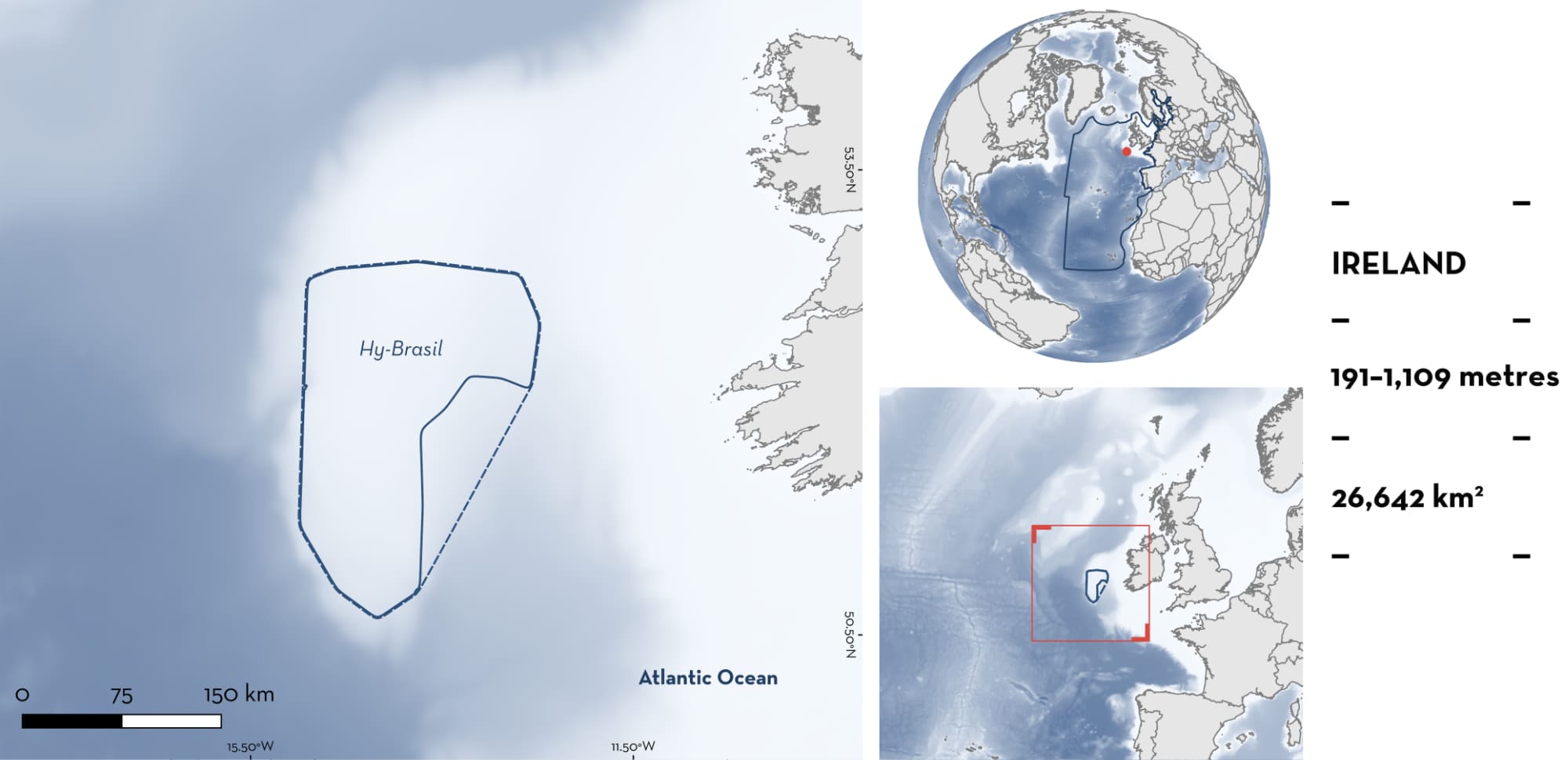 Hy-Brasil is a raised area on the Irish continental shelf, ~200 km west of Ireland. It lies at the continental margin of the Northeast Atlantic and it slopes into the Rockall Trough to the west and Porcupine Seabight to the east. A large canyon runs through the area in a northeast-southwest direction, with depth ranging from ~500 m to >2,500 m. A second canyon occurs in the south of the area with depths >2,000 m. The area is characterised by seamounts midway long the main channel (NPWS 2024a). The benthos is characterised by black, soft and gorgonian corals, as well as sponges (including encrusting forms), desmospongia, and glass sponges (NPWS 2024b). The substrate in the north of Hy-Brasil is dominated by hard ground, with small areas of soft sediment. The southern part of the area has soft sediment with occasional boulders and pebbles. Throughout the bank there are terraces, cliffs, overhangs, and boulders (NPWS 2024a).