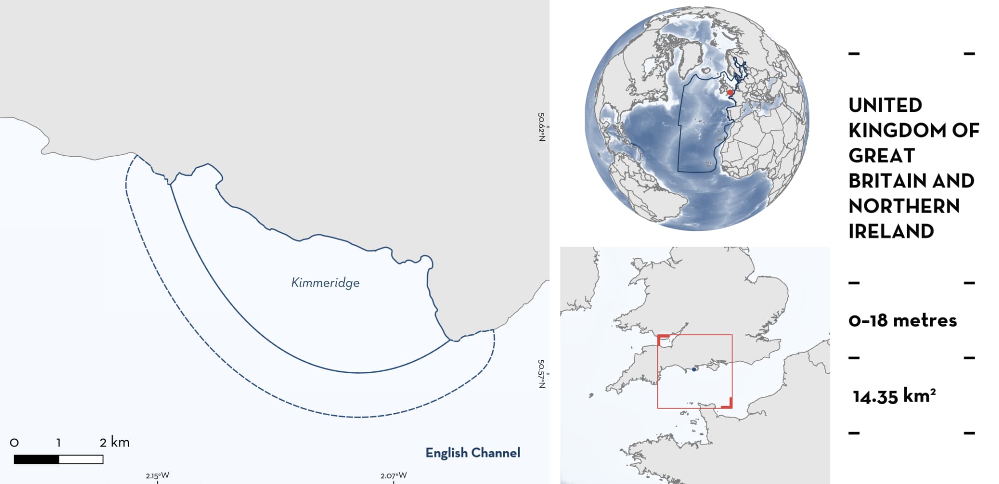 Kimmeridge is located on the south coast of England, United Kingdom of Great Britain and Northern Ireland. It is situated on the Isle of Purbeck, a peninsula in Dorset. The area is a relatively shallow bay that is characterised by rocky reefs (with algae), mudstone, and limestone (British Geological Survey 2025). The bay is in a relatively sheltered location, where rocky ledges reduce wave action. The area is influenced by prevailing south-westerly winds.