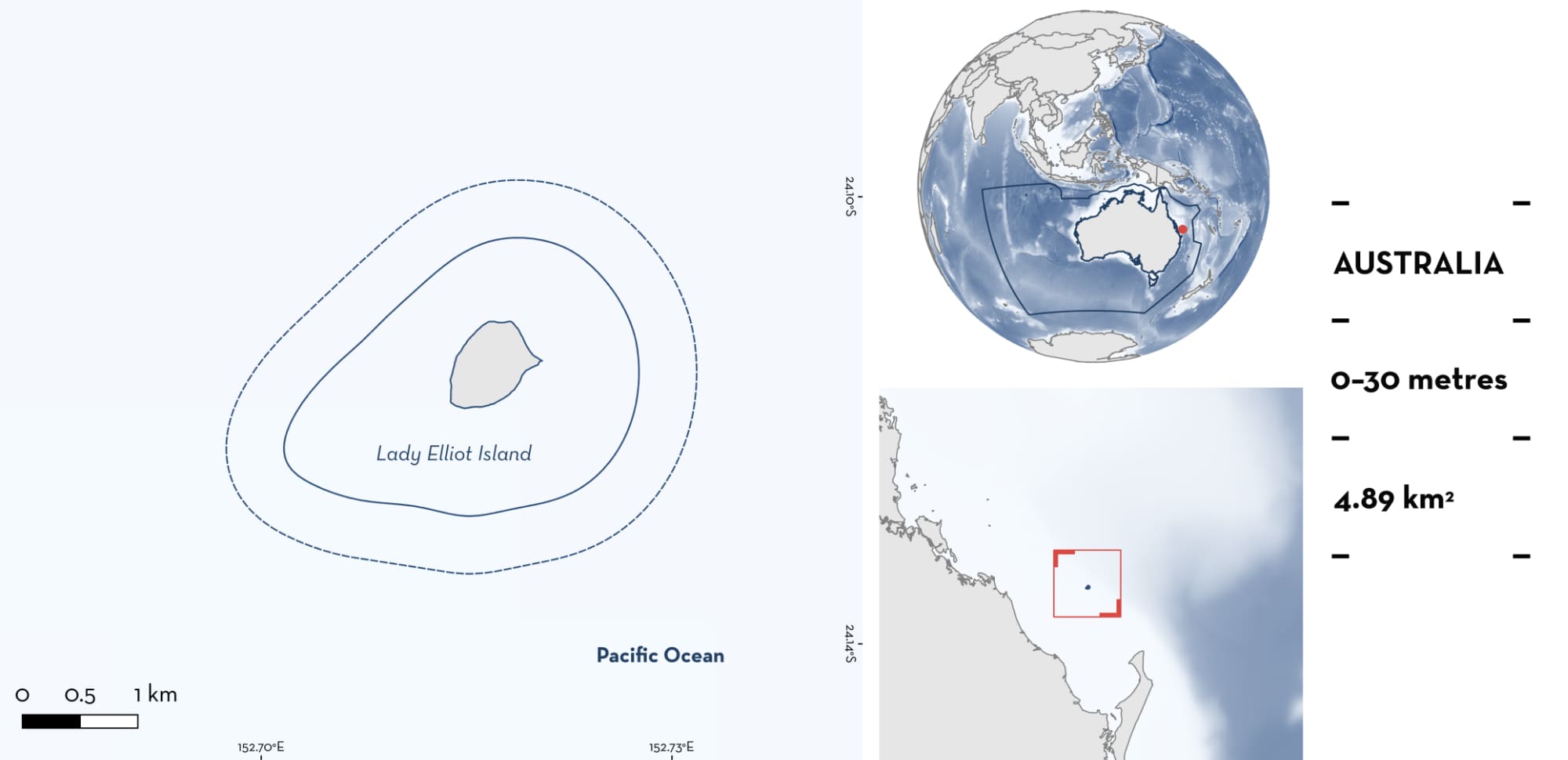 Lady Elliot Island is located in Queensland, Australia. The area surrounds a small coral cay island at the southern end of the Great Barrier Reef with a large reef flat and lagoon on its eastern side. On its western side, a narrow reef flat leads to scattered coral bommies. The area is influenced by the East Australian Current and the mesoscale oceanographic feature of the Capricorn Eddy bringing cooler, nutrient-enriched waters onto the shelf. It overlaps with the Capricornia Cays Key Biodiversity Area and the Great Barrier Reef Marine Park. Within the area there are: threatened species (e.g., Silvertip Shark Carcharhinus albimarginatus); range-restricted species (Epaulette Shark Hemiscyllium ocellatum); reproductive areas (Reef Manta Ray Mobula alfredi); feeding areas (Reef Manta Ray); and undefined aggregations (e.g., Spotted Eagle Ray Aetobatus ocellatus).