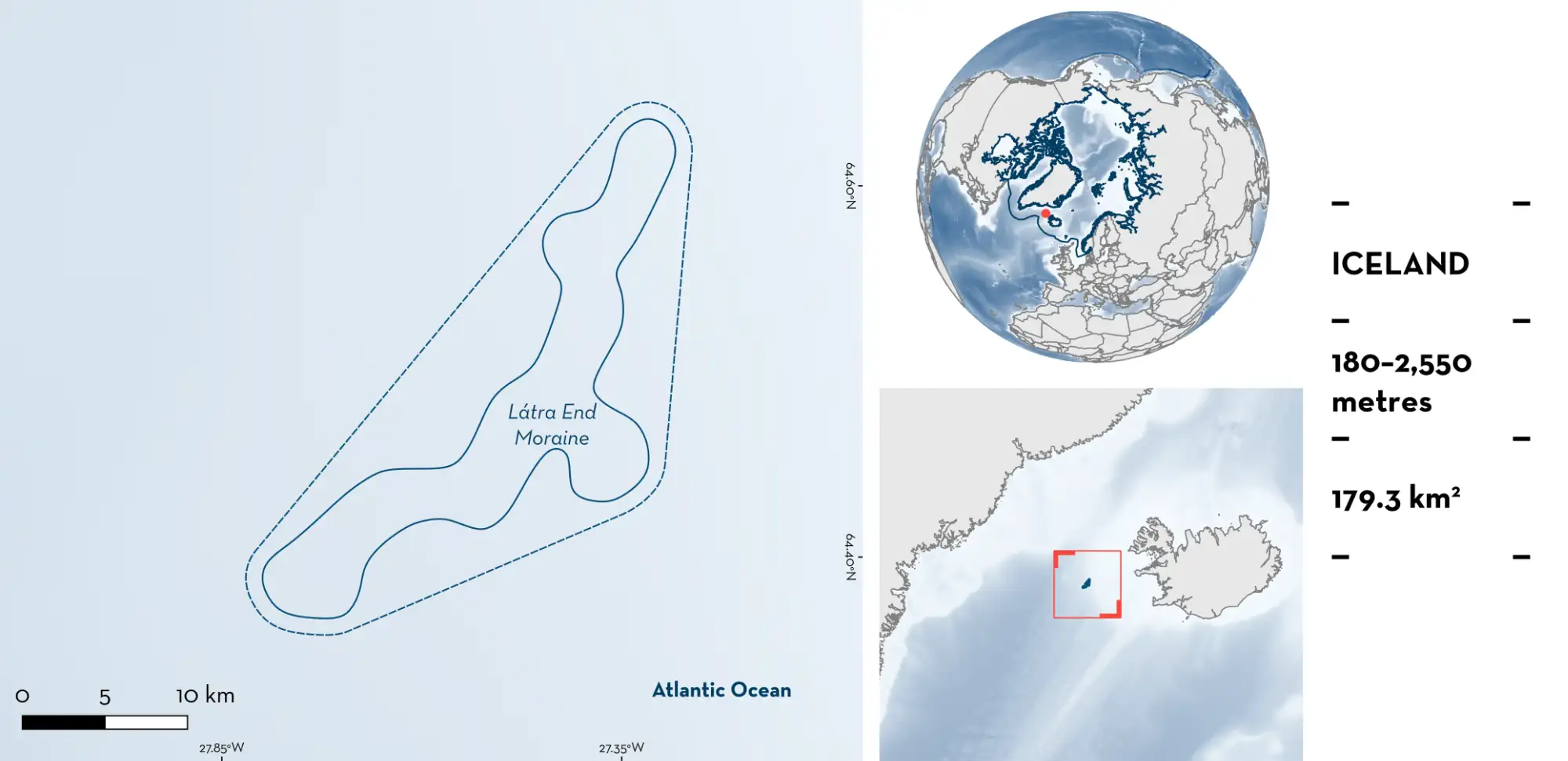 Látra End Moraine is located ~400 km off the west coast of Iceland. It is situated between Iceland and Greenland, east of Denmark Strait and west of Látra Bank (Syvitski et al. 1999). It overlaps with the longest shelf moraine on the Icelandic Shelf which is the best-preserved frontal moraine found outside a trough (Spagnolo & Clark 2009). The sediment is a mixture of sand, silt, and clay (Ostmann et al. 2014).