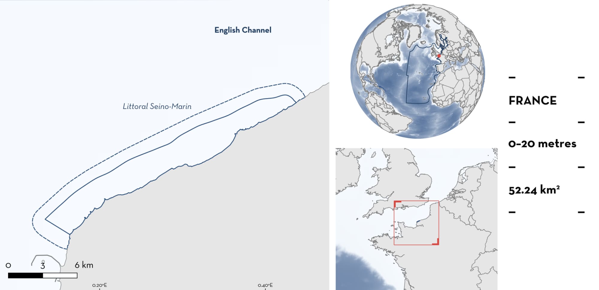 Littoral Seino-Marin is located in the eastern English Channel in France. This coastal area is influenced by freshwater outflow from the Seine River and by tides and tidal currents. The habitat is characterised by a narrow reef flat that gradually gives way to sand, gravel, and a pebble field. Within this area there are: reproductive areas (e.g., Thornback Skate Raja clavata); and feeding areas (e.g., Spotted Skate Raja montagui).
