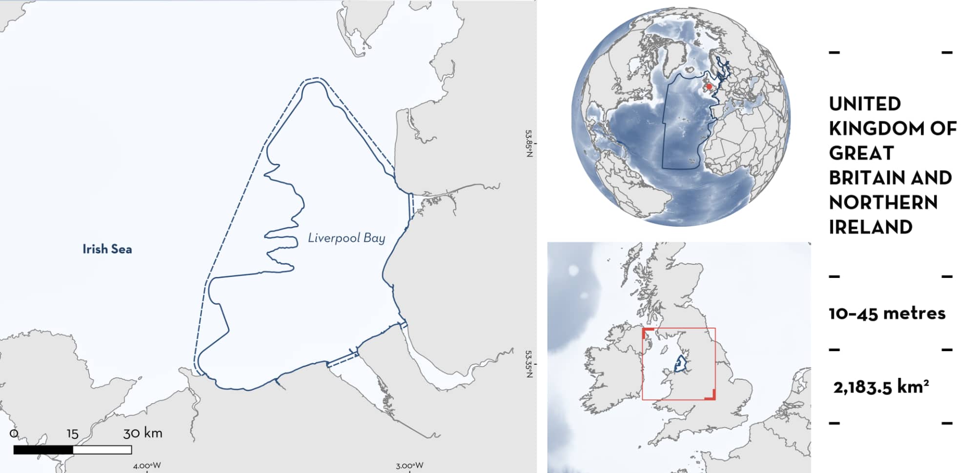 Liverpool Bay is located along the western coast of the United Kingdom of Great Britain of Northern Ireland, in the southeastern Irish Sea. The area extends approximately from Llandudno (North Wales) to Blackpool, extending north-westwards to the area outside Morecambe Bay. It is characterised by shallow nearshore waters with sandy and muddy-sandy substrates. The area is influenced by the Dee, Mersey, and Ribble estuaries due to freshwater input and variation in nutrients (Eagle 1973). The area is also influenced by large tidal currents (Polton et al. 2011).
