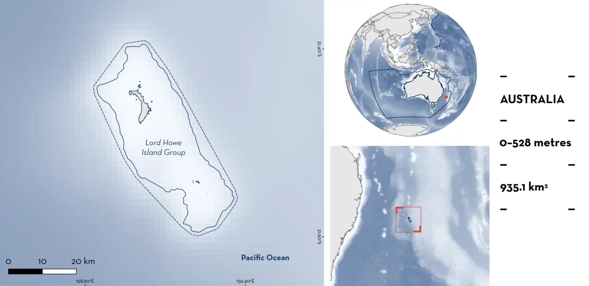 Lord Howe Island Group is located in the southwest Pacific, ~600 km off the coast of New South Wales, Australia. The area encompasses Lord Howe Island and Ball’s Pyramid: the two southernmost volcanic seamounts from a larger chain (formed from continental crust) (Environment Australia 2002). It is characterised by coral reefs (Harasti et al. 2022) and macroalgae reefs, alongside thick sediments and volcanic outcrops. This area is also characterised by submerged/bathymetric features such as canyons, volcanic cones, and pinnacles (Environment Australia 2002).