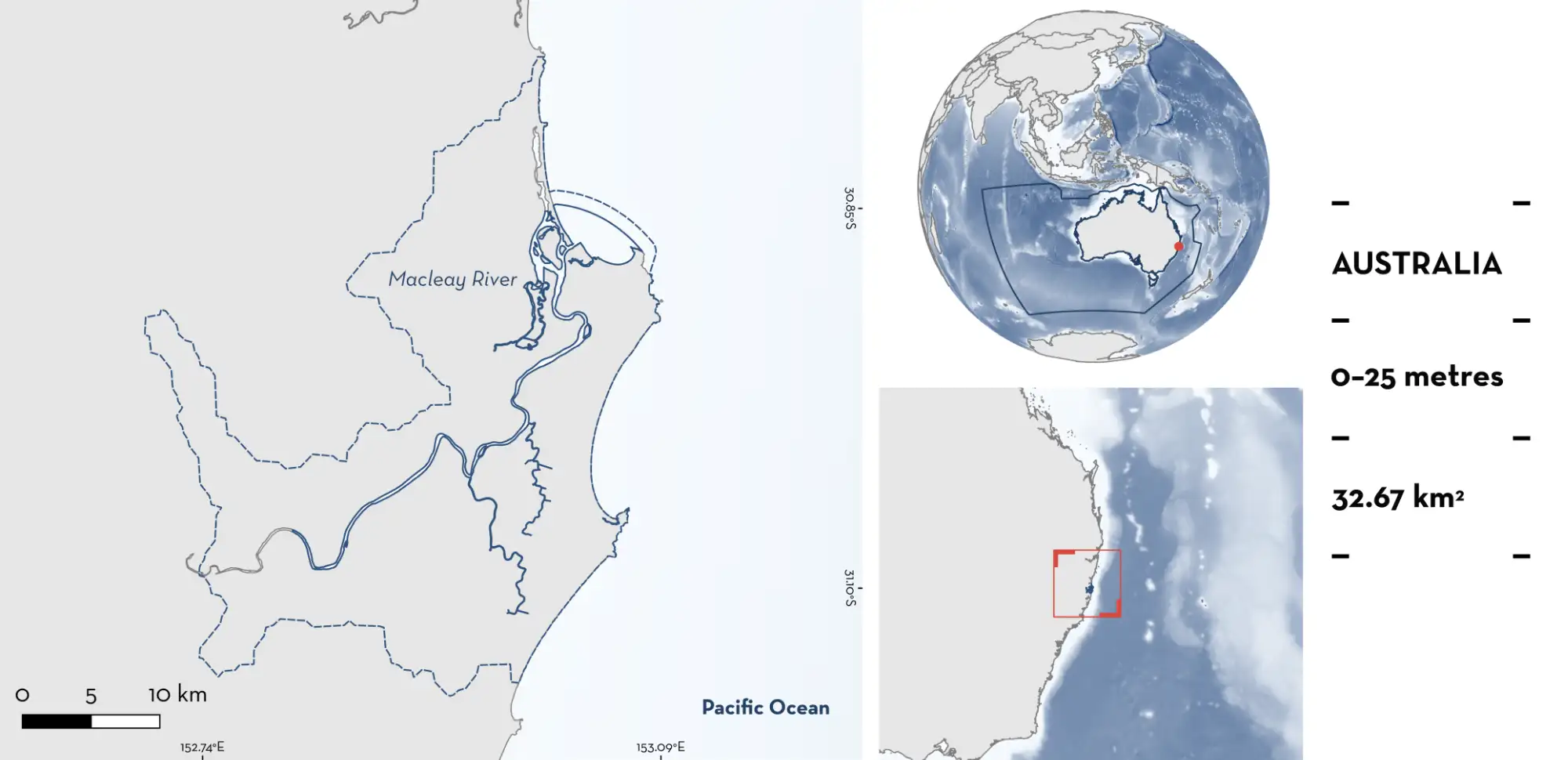 The area is influenced by tides leading to a gradient of salinities in the river, and by freshwater and sediment input from the river. The tidal limit is further upstream, outside the boundaries of this area. The coastal part of the area is influenced by the East Australian Current that carries warm water southward along Australia’s east coast (Ridgeway & Hill 2009). The East Australian Current  is a dynamic western boundary current, with mesoscale eddies influencing current strength and direction. The flow is seasonally stronger in the austral summer, and the separation location, where the current turns eastward into the Tasman Sea, also moves seasonally (Ridgeway & Hill 2009).
