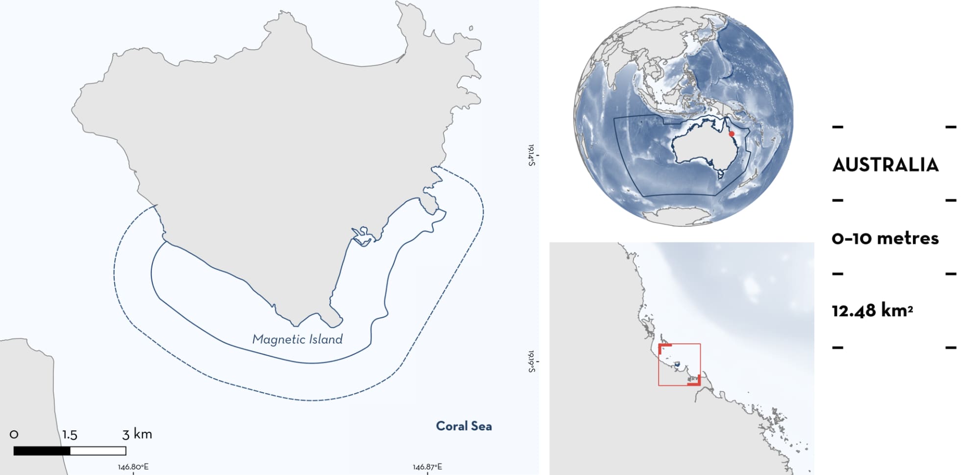 Magnetic Island is located on the southern coast of Magnetic Island, Queensland, Australia. The area encompasses Cockle, Nelly, and Geoffrey bays. The area is characterised by subtidal fringing coral reefs, intertidal foreshores, flats with coral rubble, rock, sand, and mud substrates, fringing mangroves, and intertidal and subtidal seagrass beds (Chin 2013; Chin et al. 2016). Coral boulder fields and fringing reefs occur along the outer edges of the bay (Chin et al. 2016).
