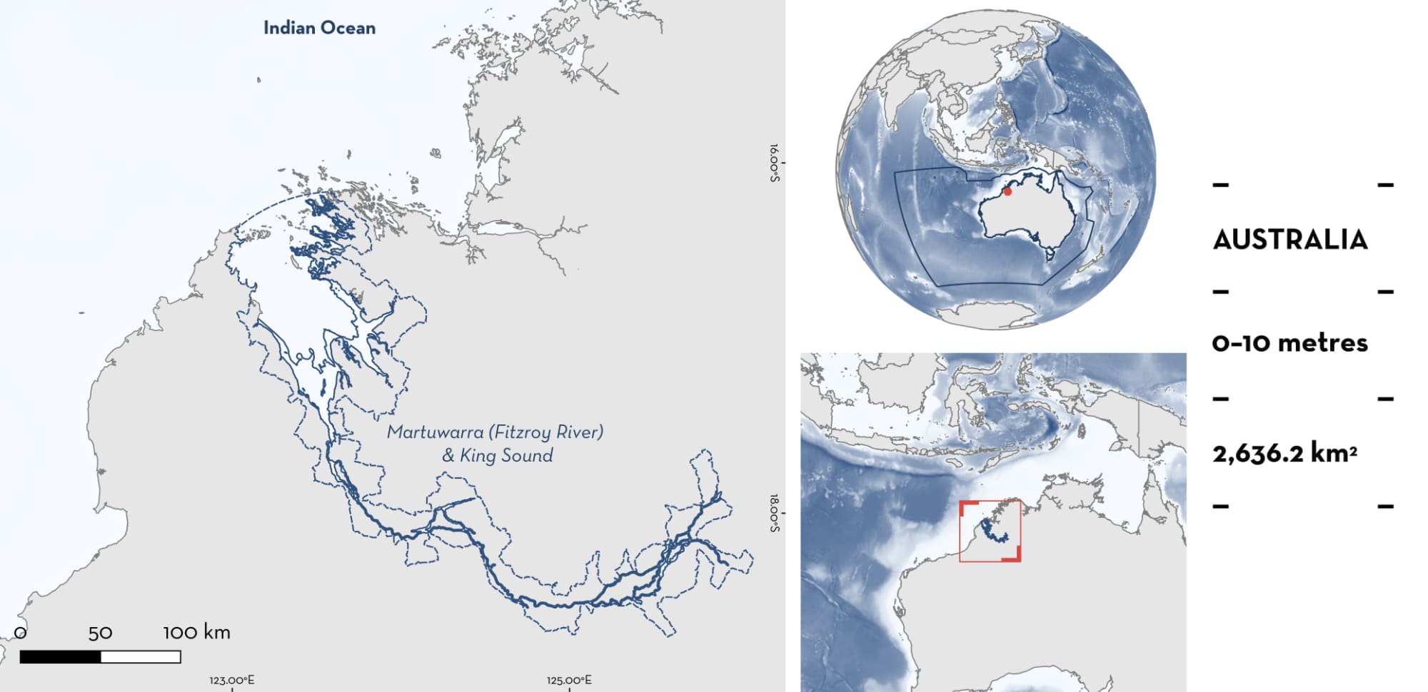 Martuwarra (Fitzroy River) & King Sound is located in the Kimberley region, Western Australia, Australia. This area encompasses the eastern margin of King Sound, the Fitzroy River estuary, and the Fitzroy River. This area is a highly dynamic system that operates under a monsoonal climate with extreme wet and dry seasons and substantial inter-annual variability in freshwater discharge. It also experiences some of the world’s largest tidal ranges. Within this area there are: threatened species (e.g., Dwarf Sawfish Pristis clavata); reproductive areas (e.g., Bull Shark Carcharhinus leucas); and resting areas (Largetooth Sawfish Pristis pristis).