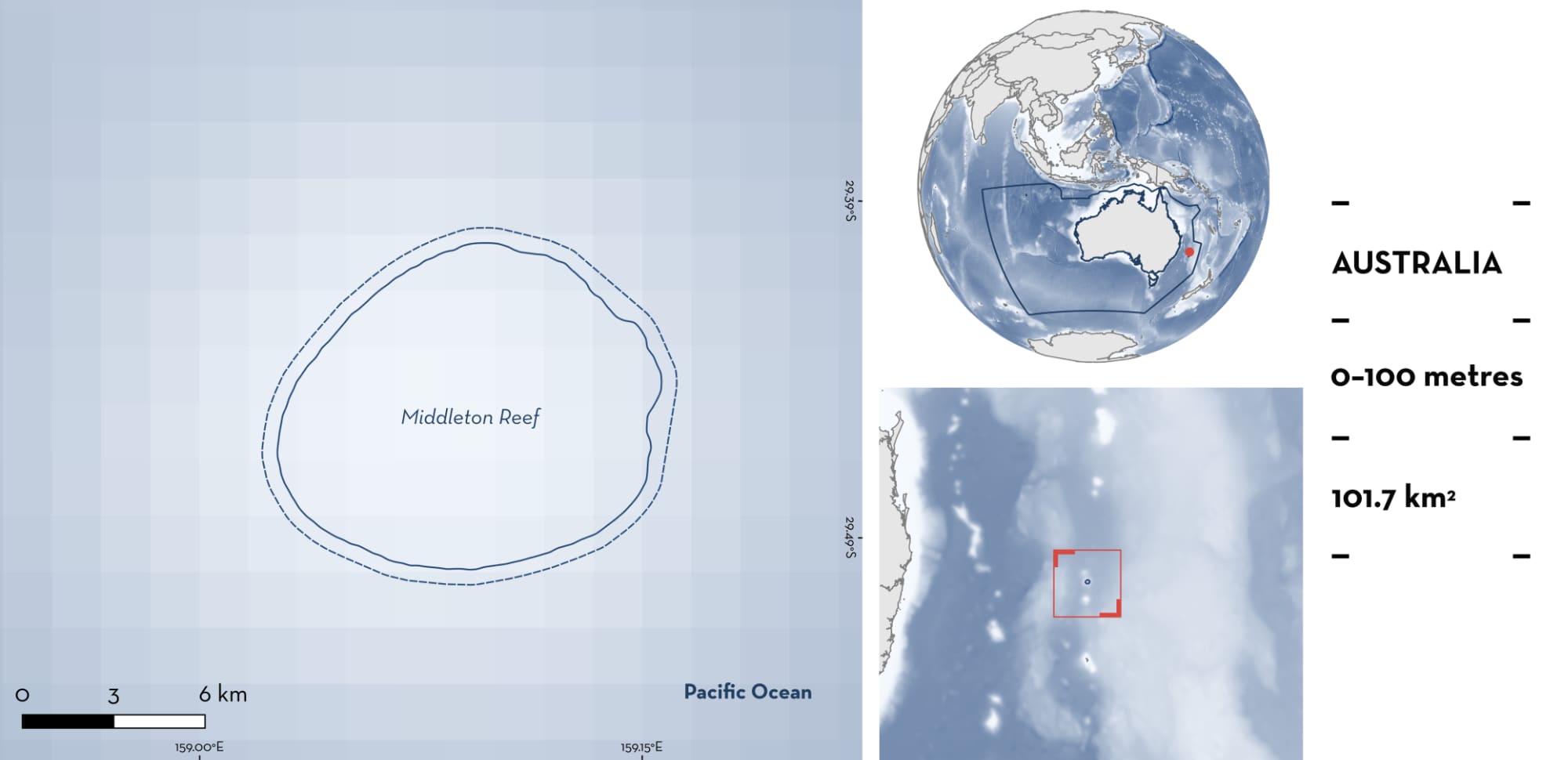 Middleton Reef is located in the southwest Pacific, ~560 km from mainland New South Wales, Australia. This remote area encompasses an atoll-like reef structure upon a seamount. It is one of the two southernmost platform reefs in the world (Carroll et al. 2021). The area includes exposed reef, inner lagoon, and back reef. This area is characterised by coarse sand and gravel substrates, becoming increasingly composed of pebbles at greater depths. The fine sandy substrate in the northern part of Middleton Reef is also characterised by bacterial mats between 31–50 m depth. There are also coral reefs and sponges in the area (Carroll et al. 2021).