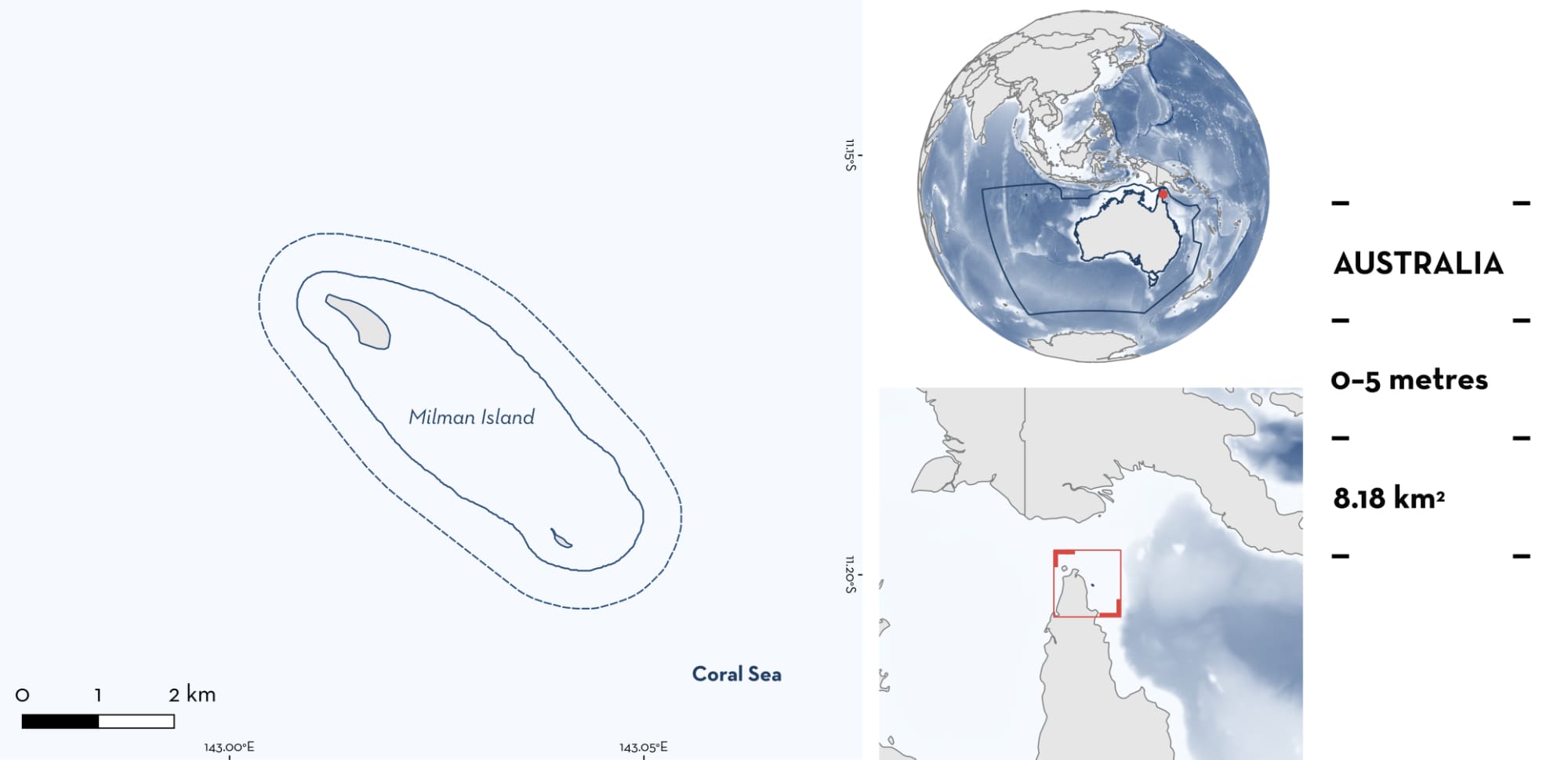 Milman Island is located off Cape York Peninsula, Queensland, Australia. It is situated 45 km offshore of Cape York Peninsula. The area encompasses Milman Island and Aplin Islet and is part of the Denham group of islands. It is an uninhabited, densely wooded sand cay connected to Aplin Islet, a small coral rubble island. The area is characterised by a large reef flat with sand, fringed with a rubble reef crest that extends around most of the island and dries during low tide (Freeman 2019; Freeman & Wright 2021).