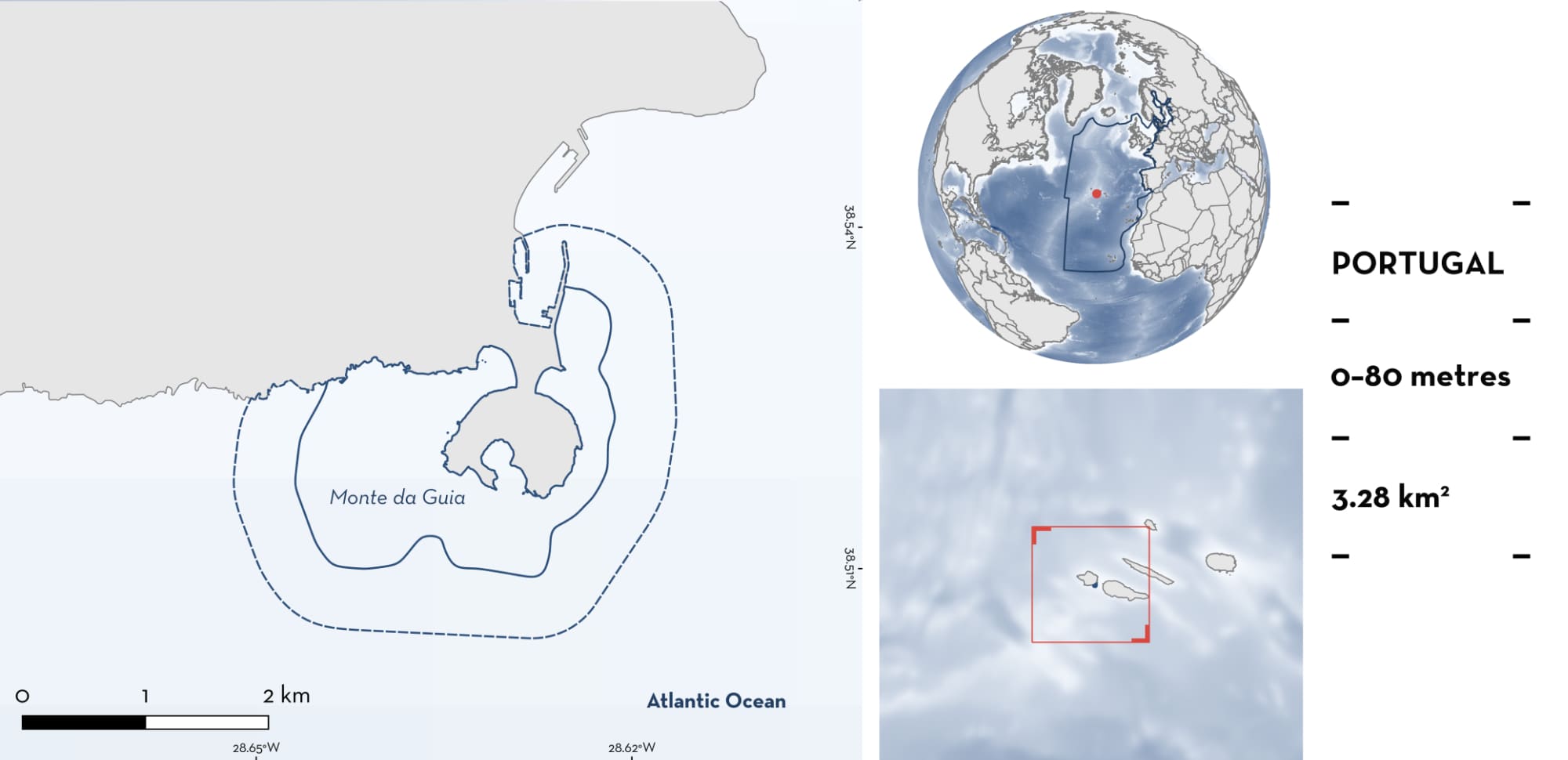 Monte da Guia is located on the southeast coast of Faial Island in the Azores, Portugal. This area encompasses the surrounding waters of the Monte da Guia volcanic crater, including high to moderately exposed zones and sheltered areas with a diversity of coastal habitat types such as rocky reefs, vertical walls, bolder fields, gravel, rhodoliths, and sandy substrate (EEA 2025). Entre-Montes Bay in the northeast corner and Porto Pim Bay in the northwest corner are sheltered, low energy habitats bounded by high-energy, structurally complex habitat where strong tidal currents pass through vertical walls and boulder fields (Afonso et al. 2008).