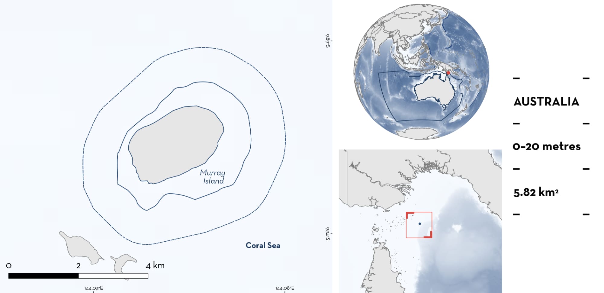Murray Island is located on the eastern shelf of Torres Strait, Queensland, Australia. The area is a basaltic island formed from an extinct volcano. It is characterised by a shallow lagoon surrounded by a coral reef, with its crests often very shallow and sometimes exposed at low tides (P Cogollos pers. obs. 2024). The outer reef crest, outside the area, slopes steeply, descending rapidly to 80 m.
