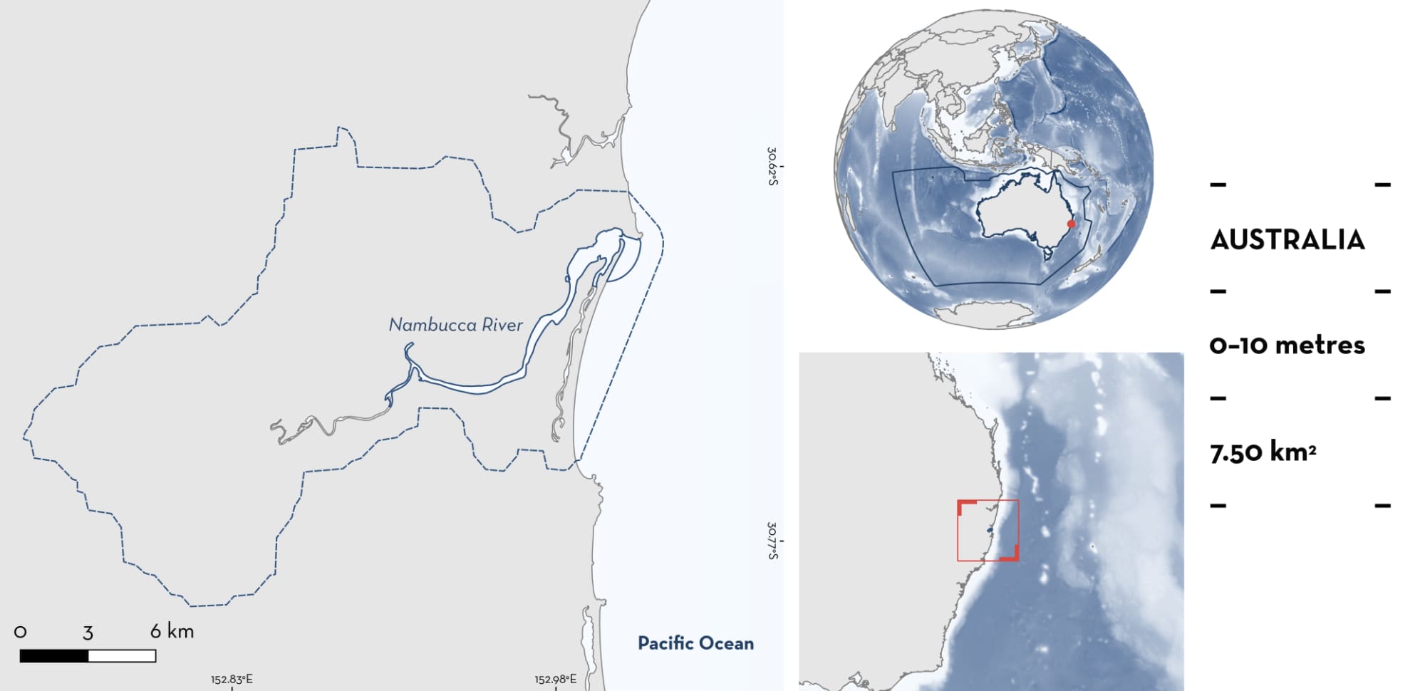 Nambucca River is located on the mid-north coast of New South Wales, Australia. The area is situated between Coffs Harbour and Port Macquarie. It comprises riverine and estuarine waters in the lower reaches of the Nambucca River that drains a catchment of 1,407 km2 (Doyle 2003). The area extends from the river mouth to ~15 km upstream. The habitat is characterised by soft substrates, sandbanks, islands, and mangroves. The riverbank is mostly agricultural land.