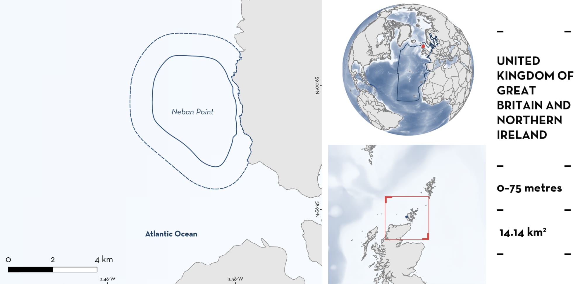 Neban Point is located in the Orkney Islands of Scotland, United Kingdom of Great Britain and Northern Ireland. It is situated ~40 km from mainland Scotland, on the Atlantic-facing west coast of Orkney mainland. The Orkney Archipelago comprises over 70 islands, separated by bays and dynamic tidal channels (Neill et al. 2014). The coastline of Neban Point is dominated by sea cliffs and coastal stacks. The inshore habitat features rocky reefs that transition into a narrow band of boulder reef running parallel to the coastline. Beyond 50 m depth, the seabed shifts to coarse, rippled sediments. A secondary boulder reef is present in ~70 m depth, marking the boundary of the area.