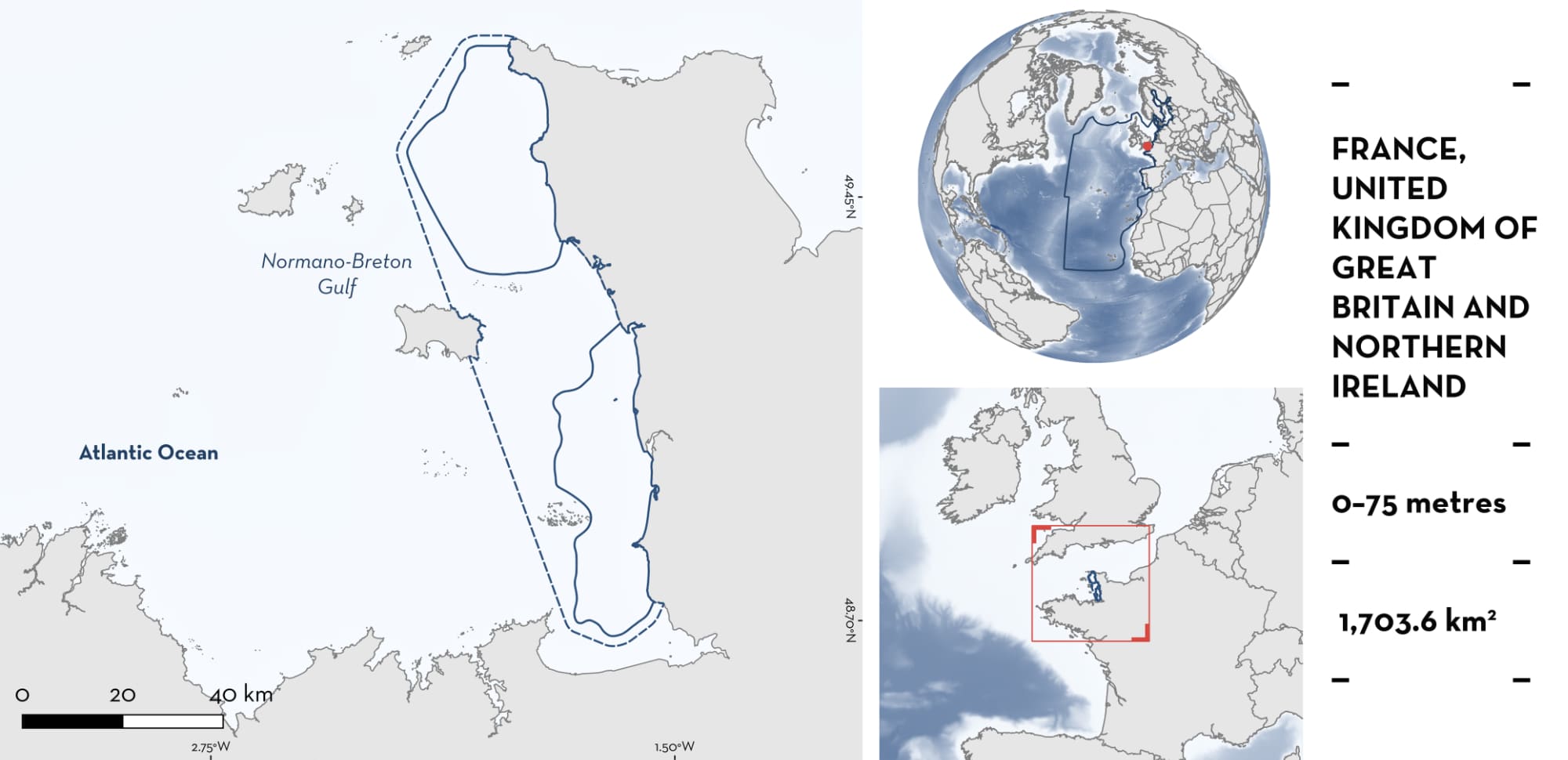 Normano-Breton Gulf is located in northern France and the eastern Channel Islands of the United Kingdom of Great Britain and Northern Ireland. This split area includes one part extending from the northwestern tip of the Cotentin Peninsula to north of Jersey Island and another part stretching along the coast of the southwestern Cotentin Peninsula. The rugged seabed and shallow depth of the area, combined with its complex hydrodynamics result in a natural mosaic of marine habitats. It is characterised by sandy-mud and coarse sediment substrates for the most part, dotted with areas of rocky reefs, eelgrass beds (Zostera spp.), kelp forests, benches of marine worms (e.g., Lanice spp.), and biogenic Hermelles reefs (Furgerot et al. 2019). The area is also punctuated by islands and rocky plateaus.
