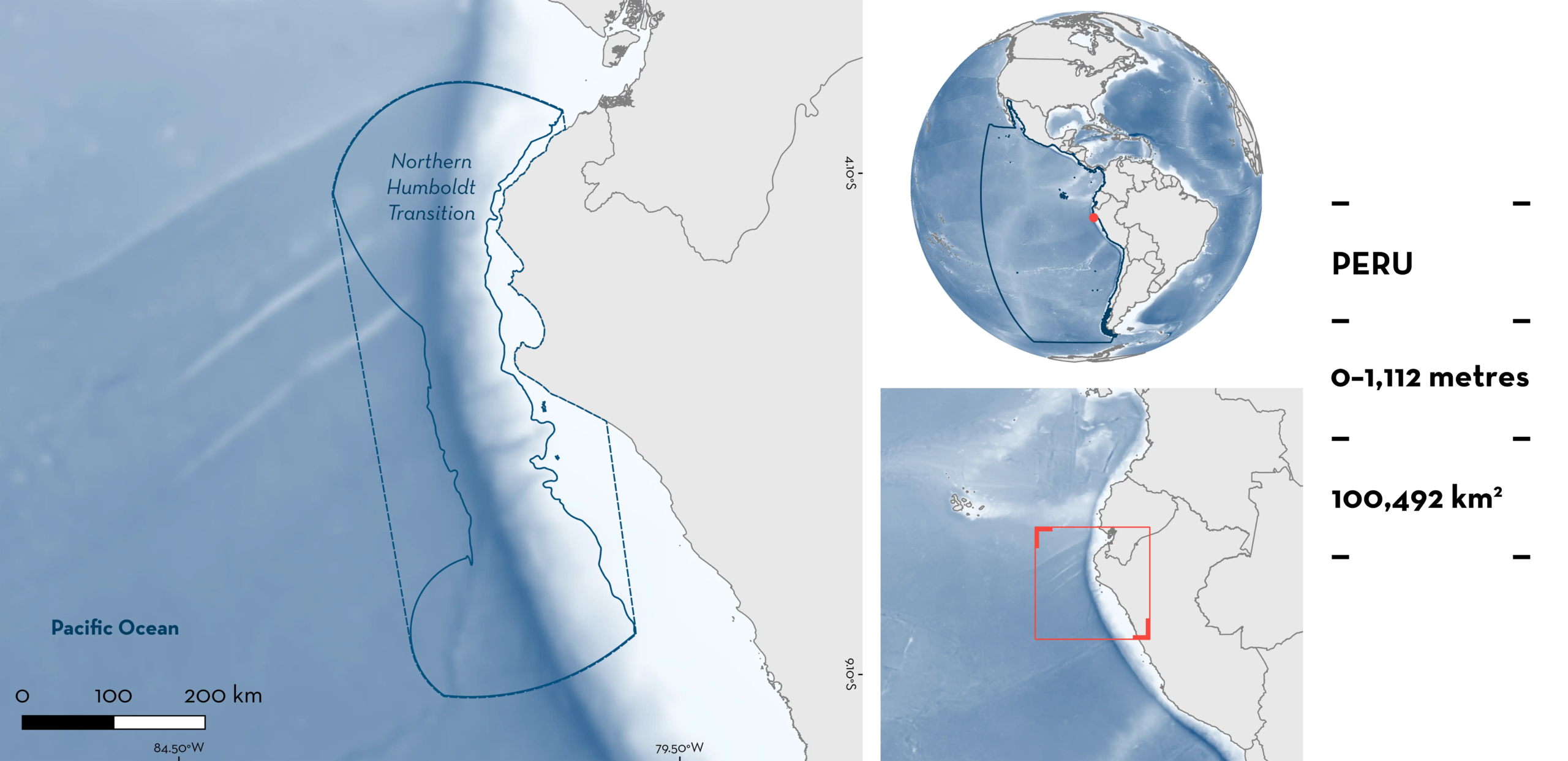 Northern Humboldt Transition is located in northern Peru. The area is characterised by several oceanographic features, including the Equatorial Front and the Northern Humboldt Current System, within which major upwelling centres are located. It also is influenced by the Gulf of Guayaquil which constitutes the most important estuary associated to the largest fluvial system of the entire western slope of the Andes. Within this area there are: threatened species (e.g., Munk’s Pygmy Devil Ray Mobula munkiana); reproductive areas (Spinetail Devil Ray Mobula mobular); feeding areas (e.g., Common Thresher Alopias vulpinus) and, undefined aggregations (e.g., Bentfin Devil Ray Mobula thurstoni).