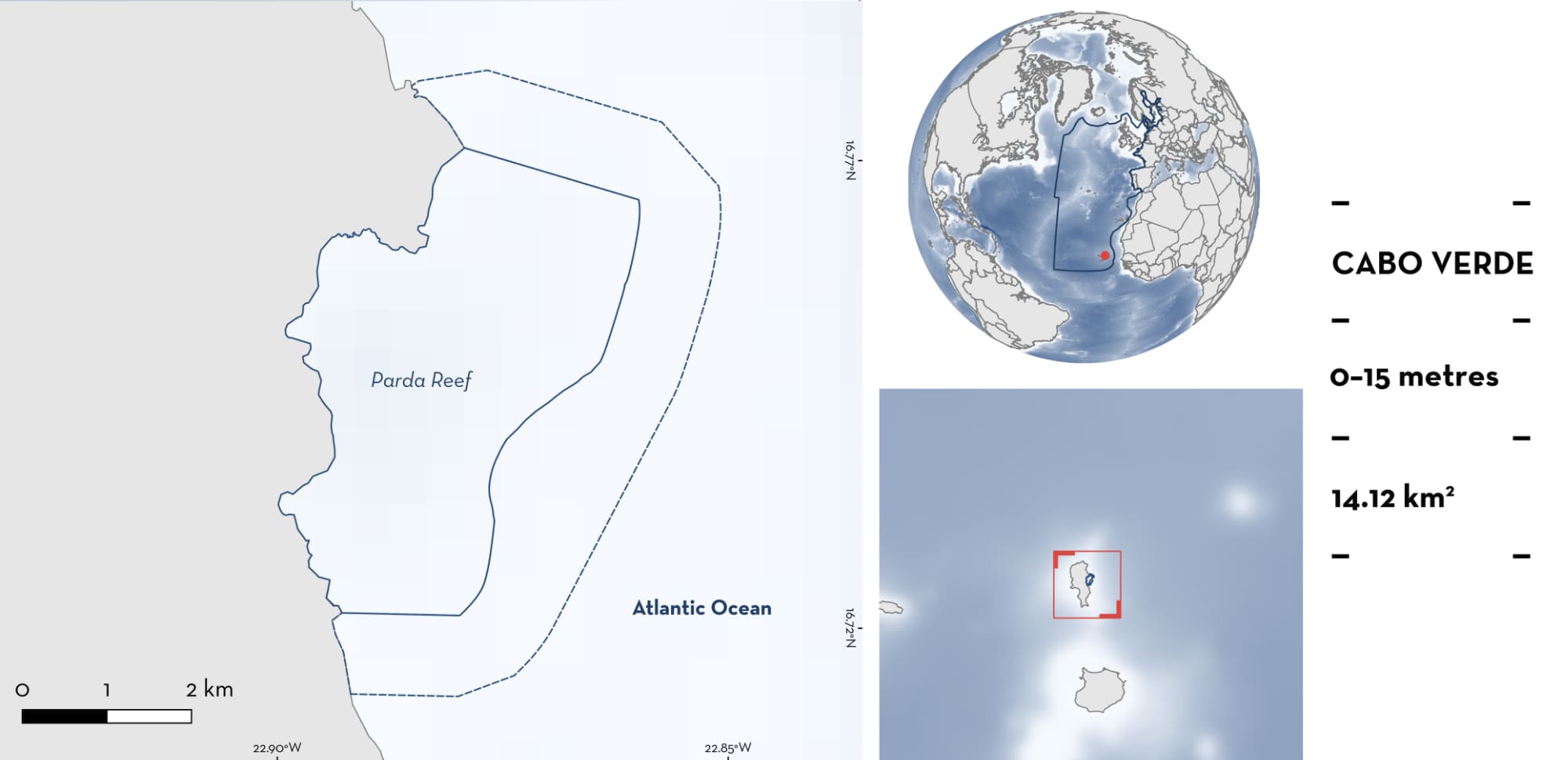 Parda Reef is located on northeast Sal Island, Cabo Verde. The habitat is composed of basaltic rock from ancient eruptions, forming a shallow rocky reef. The northern and southern sections of the area encompass two small narrow beaches Within this area there are: threatened species and reproductive areas (Lemon Shark Negaprion brevirostris).