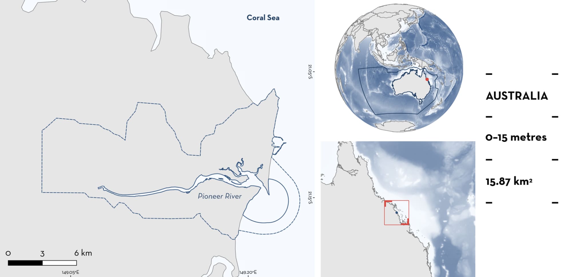 Pioneer River is located in north Queensland, Australia. The area extends from the river mouth to Dumbelton Weir, ~16 km upstream. The Pioneer River drains a catchment of ~1,500 km2 and enters the Coral Sea in the city of Mackay (Bradley et al. 2023). The habitat in this area is characterised by mangroves, intertidal sand flats, engineered rock walls, and urban and agricultural land adjoining the riverbank (Bradley et al. 2023).