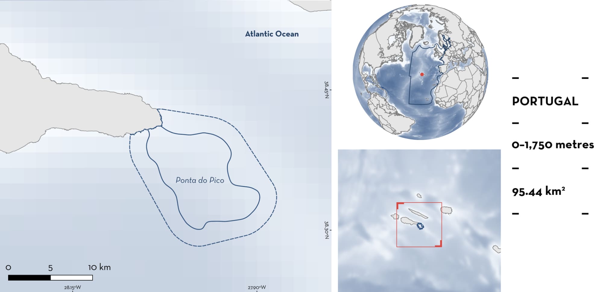 Ponta do Pico is located on the southeast coast of Pico Island, in the Azores Archipelago, Portugal. The coastline is characterised by bays, inlets, and rocky reefs with an absent shelf in the steep south facing wall and a long submarine prolongment of the island towards the southeast forming a large and productive bank. Sea surface temperatures are lower in the boreal winter and higher in summer, with chlorophyll-a concentrations being highest in winter and spring. Within this area there are: threatened species and feeding areas (Whale Shark Rhincodon typus).