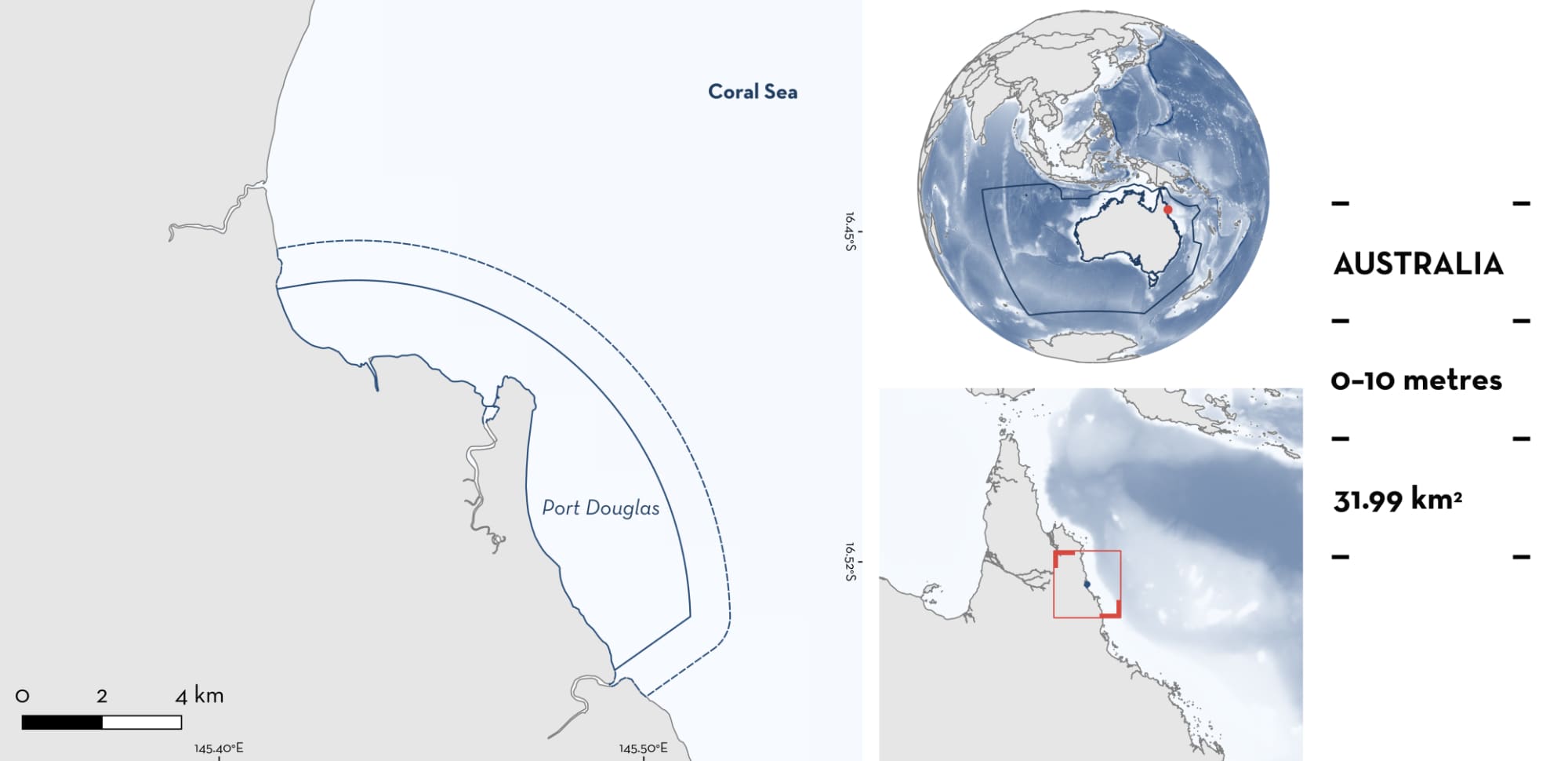 Port Douglas is located in northeast Queensland, Australia. It encompasses the coast around the city of Port Douglas north of the Mowbray River. The area is characterised by inner-shelf reefs, sandy beach ridges, a mangrove-lined estuary, seagrass meadows, and mud and sand substrates. It is influenced by tides, storm waves, and prevailing southeasterly trade winds. The area overlaps with the Great Barrier Reef Marine Park. Within this area there are: threatened species and reproductive areas (Blacktip Reef Shark Carcharhinus melanopterus).