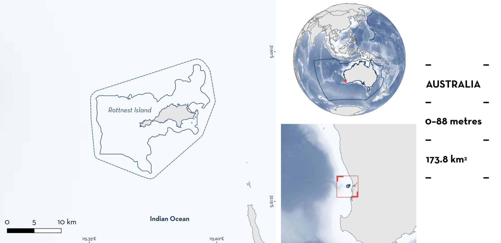 Rottnest Island is located in Western Australia, Australia. This area is situated ~18 km off the coast of Perth and is the only mid-shelf island on the lower west coast of Australia. The habitat is characterised by caves and limestone reefs dominated by kelp and includes macroalgae, seagrass meadows, and corals. Within the area there are: threatened species (e.g., Sand Tiger Shark Carcharias taurus); range-restricted species (Striped Stingaree Trygonoptera ovalis); and undefined aggregations (Sand Tiger Shark).