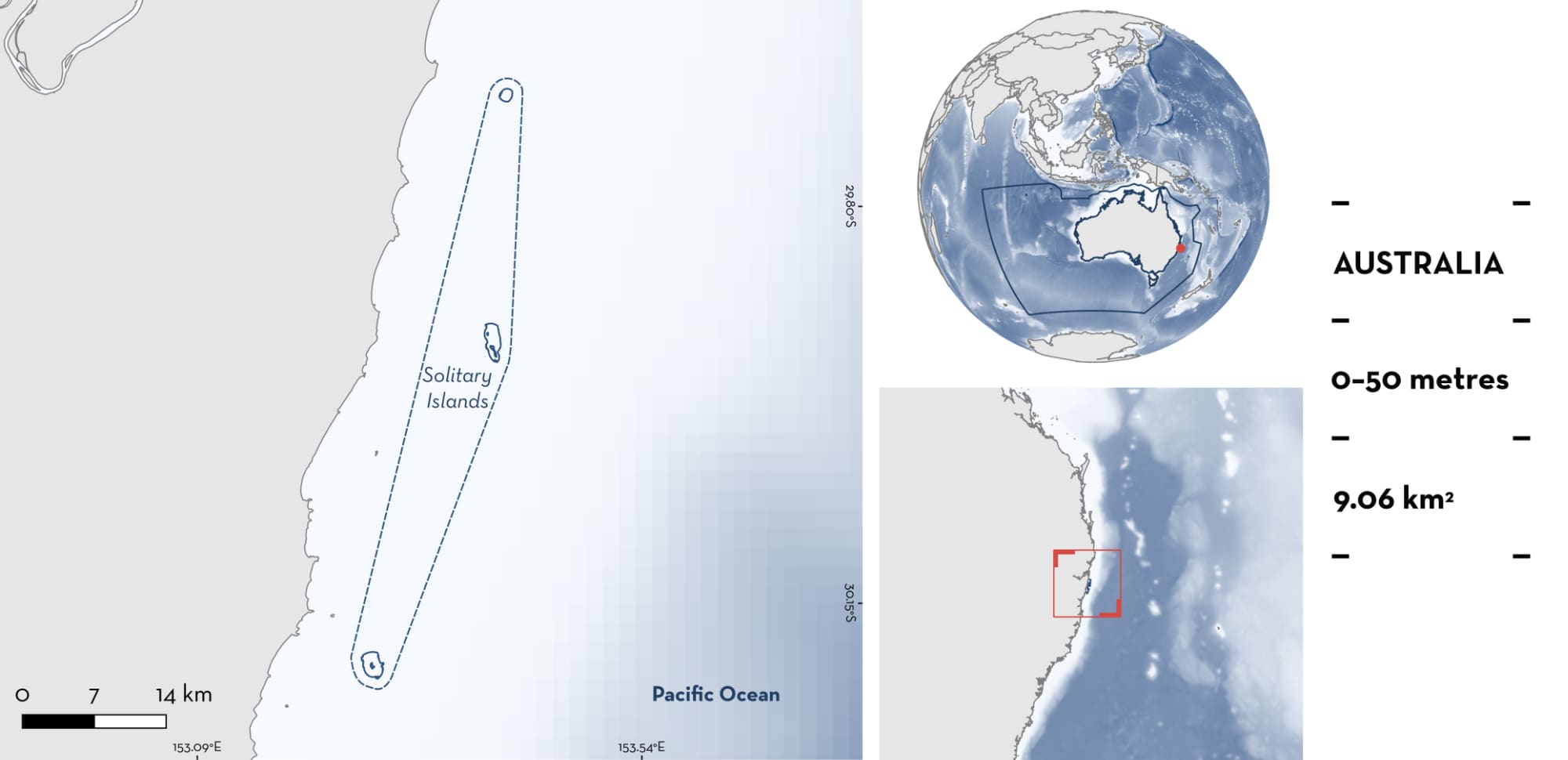 Solitary Islands is located on the mid-north coast of New South Wales, Australia. This split area includes three sites: Pimpernel Rock, North Solitary Island, and South Solitary Island. Pimpernel Rock comprises a large pinnacle bisected by a large cave and gutter system. It is situated ~7.5 km offshore from the coastline with the depth ranging from 12 m (at the top of the pinnacle) to ~50 m depth (Malcolm et al. 2025). The three islands contain rocky reefs with hard and soft coral communities, and complex gutter systems (Parks Australia 2025).