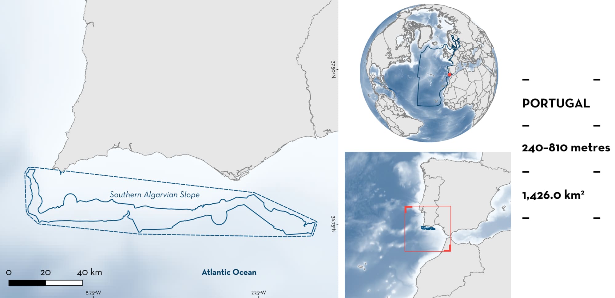Southern Algarvian Slope is located off the coast of the Algarve region of southern Portugal. The area is characterised by submarine canyons, rocky reefs, and sandy substrates. It overlaps with the West Iberia Canyons and Banks Ecologically or Biologically Significant Marine Area. Within this area there are: threatened species (e.g., Knifetooth Dogfish Scymnodon ringens); range-restricted species (e.g., Iberian Pygmy Skate Neoraja iberica); reproductive areas (Portuguese Dogfish Centroscymnus coelolepis); feeding areas (e.g., Smooth Lanternshark Etmopterus pusillus); and the area sustains a high diversity of sharks (14 species).