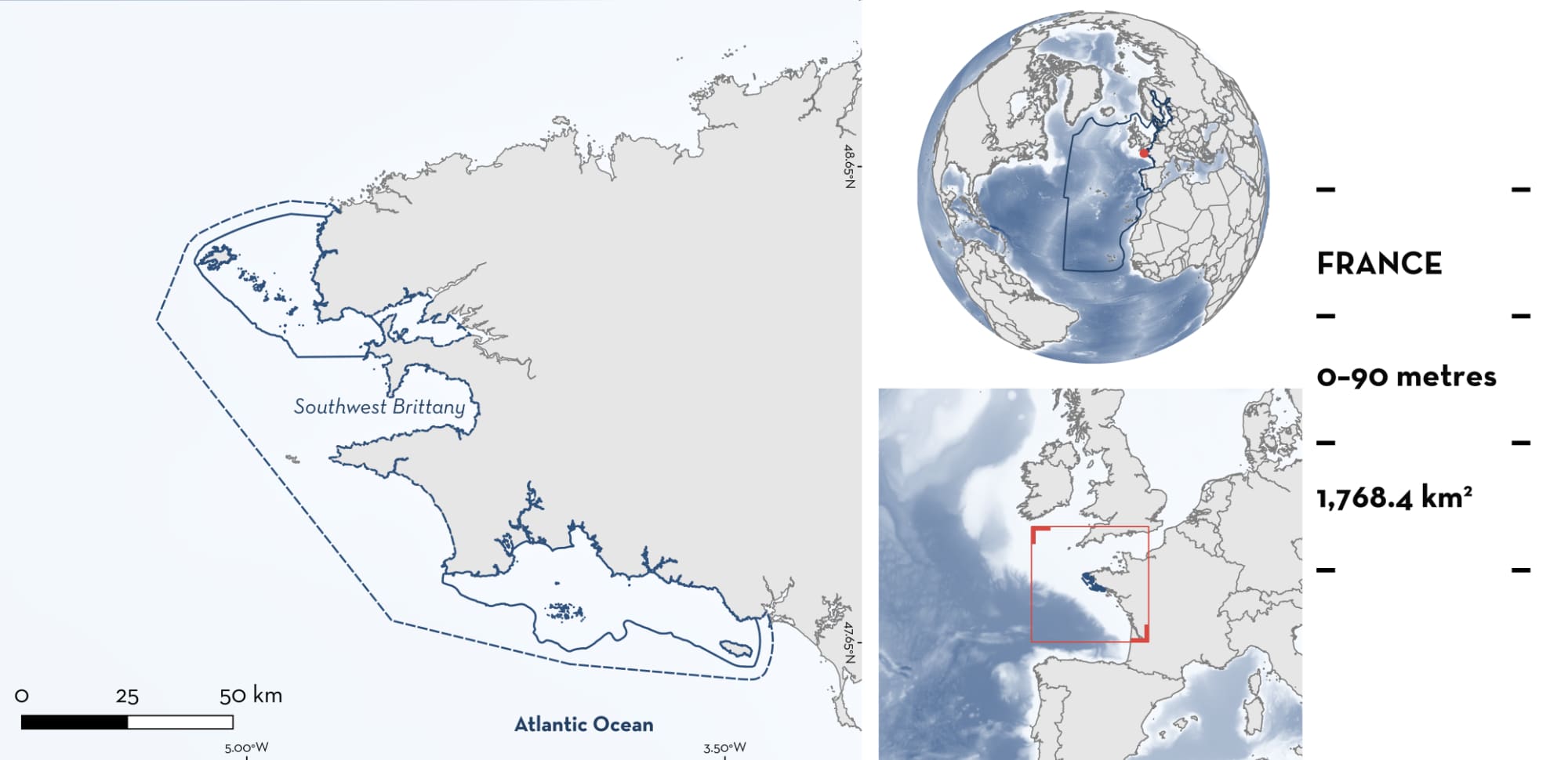 Southwest Brittany is located in the northwest of France. This split coastal area consists of a southern section around the Glénan Archipelago and Groix Island, and a northern section in the Iroise Sea around the Molène Archipelago and Ouessant (Ushant) Island. The habitat is characterised by rocky substrates, boulders, gravel, soft sediment substrates, and kelp forests. The area is influenced by strong tidal currents and tidal and thermal fronts. Within the area there are: threatened species and feeding areas (Basking Shark Cetorhinus maximus).