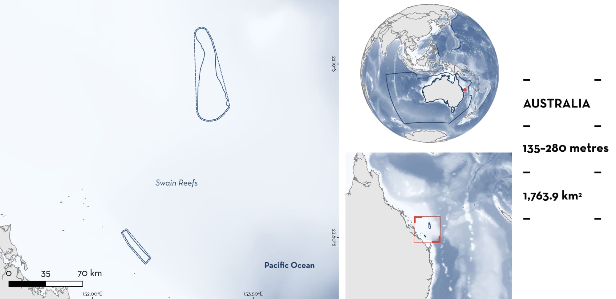 Swain Reefs is located off central Queensland, Australia. This split area is situated on the outer edge of the continental shelf on the southern Great Barrier Reef. The reef lies ~200 km off the coast of mainland Australia, and is characterised by a mosaic of small, flat-topped platforms beside a steep drop-off. The area is dominated by hard coral coverage, which creates various structures including caves, overhangs, terraces, and ledges (Marine Life Network 2025). The substrate is sandy (Marine Life Network 2025). It is separated from mainland Australia by the Capricorn Channel (Benthuysen et al. 2022).