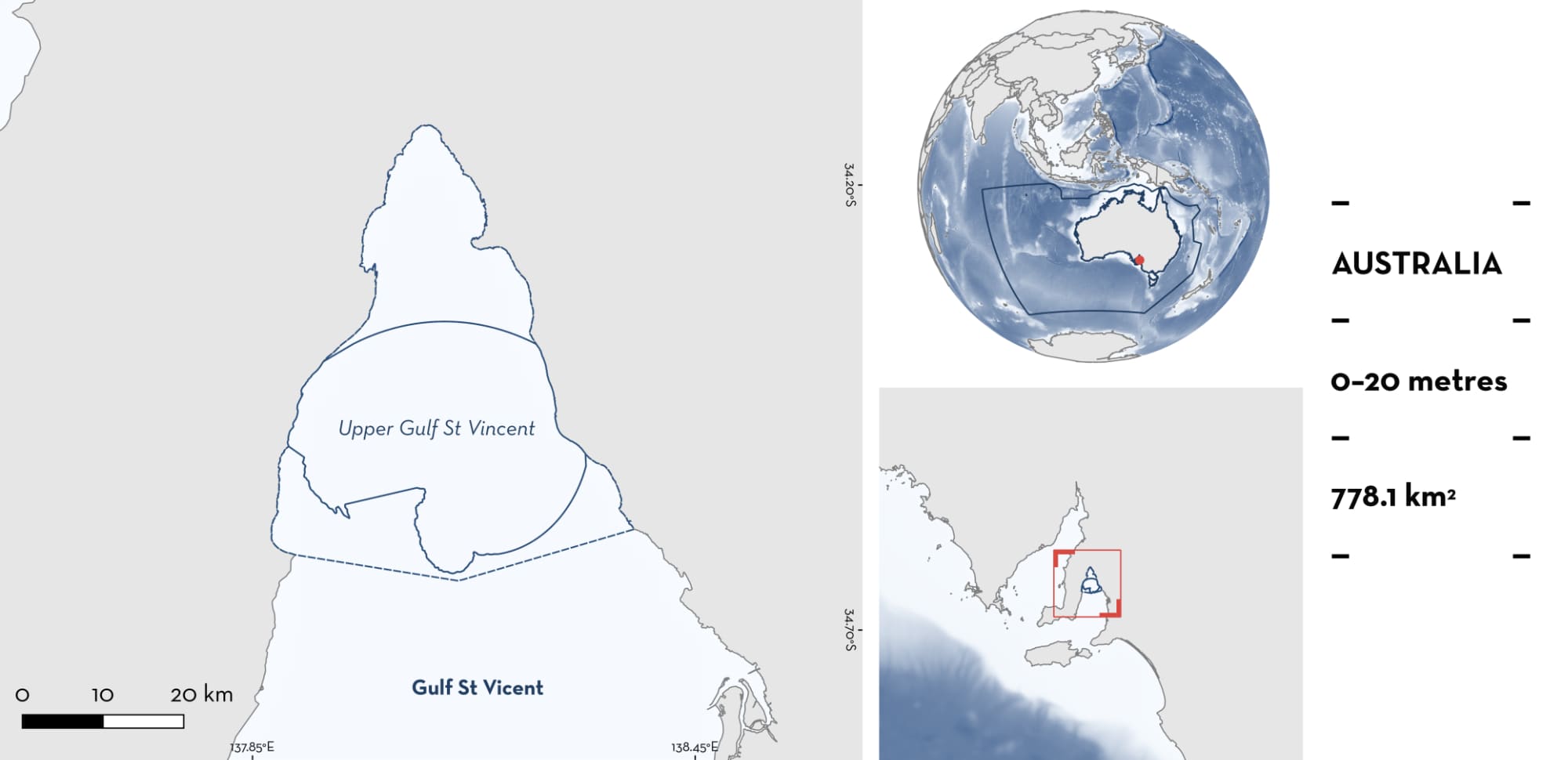 Upper Gulf St Vincent is located in South Australia, Australia. It is found in the northernmost part of the Gulf St Vincent. The area is shallow and is characterised by the presence of dense seagrass (Posidonia, Zostera, and Amphibolis spp.) habitats and silty substrates (Edyvane 1999).