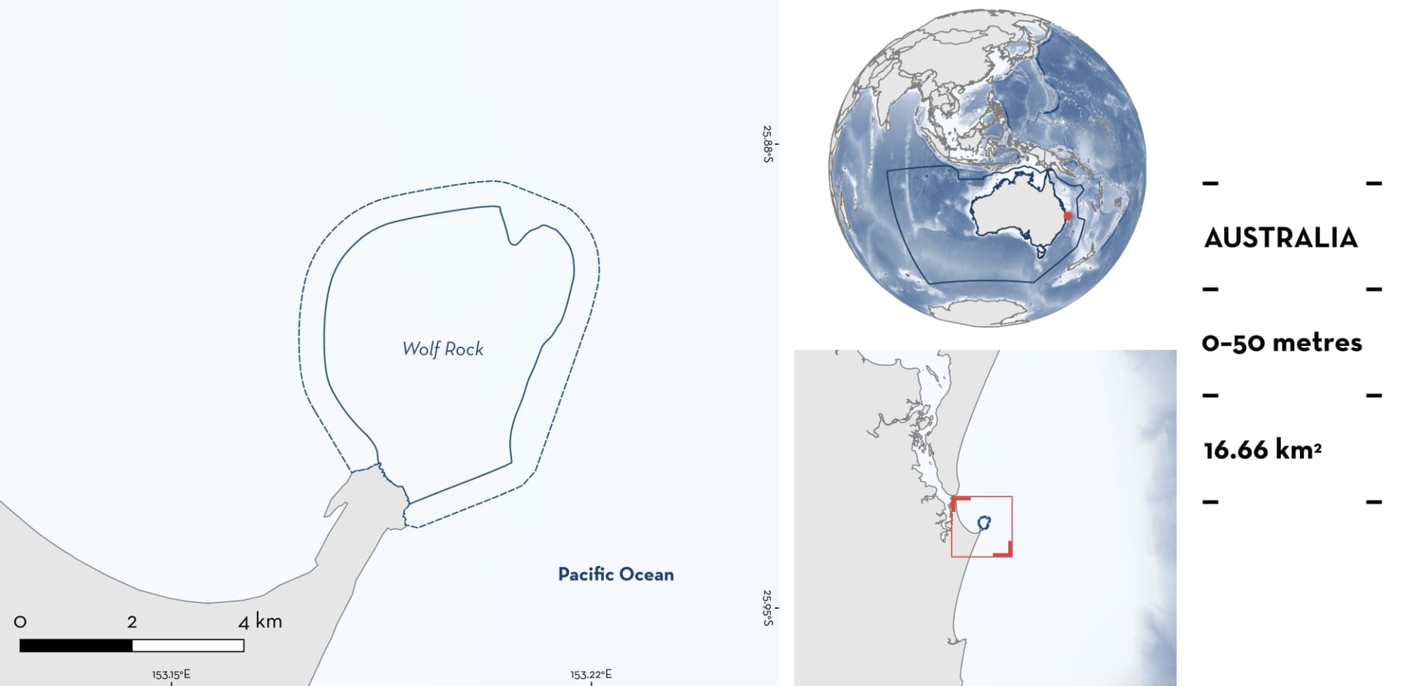 Wolf Rock is located off Double Island Point, Queensland, Australia. The area includes three main structures: Wolf Rock, Round Rock, and The Pinnacles. The main Wolf Rock structure consists of a series of four volcanic rock pinnacles aligned in a northeasterly direction, with the two most northerly pinnacles breaking the water surface under all tidal conditions (Bansemer & Bennett 2009). The immediate area around the volcanic pinnacles has a maximum depth of 35 m and is characterised by a range of steep walls, gullies, and rocky plateaus with varying benthic environments including sandy substrates, rugged boulder country, and rock covered by heads of hard and soft coral. Round Rock is located south-southeast of the central structure of Wolf Rock and consists of a single volcanic rock mound surrounded by sand flats and, on its southern side, rocky rubble. The top of the rocky mound sits at a depth of ~6 m with sandy substrates immediately around the mound reaching a maximum depth of ~16 m. The Pinnacles is located to the east of the central structure of Wolf Rock. The site consists of multiple volcanic rocky reef structures with a depth range of ~24–43 m and the benthos consisting of sandy substrates, rugged boulder country, and rocky reef covered by heads of hard and soft coral (Queensland Government 2024).